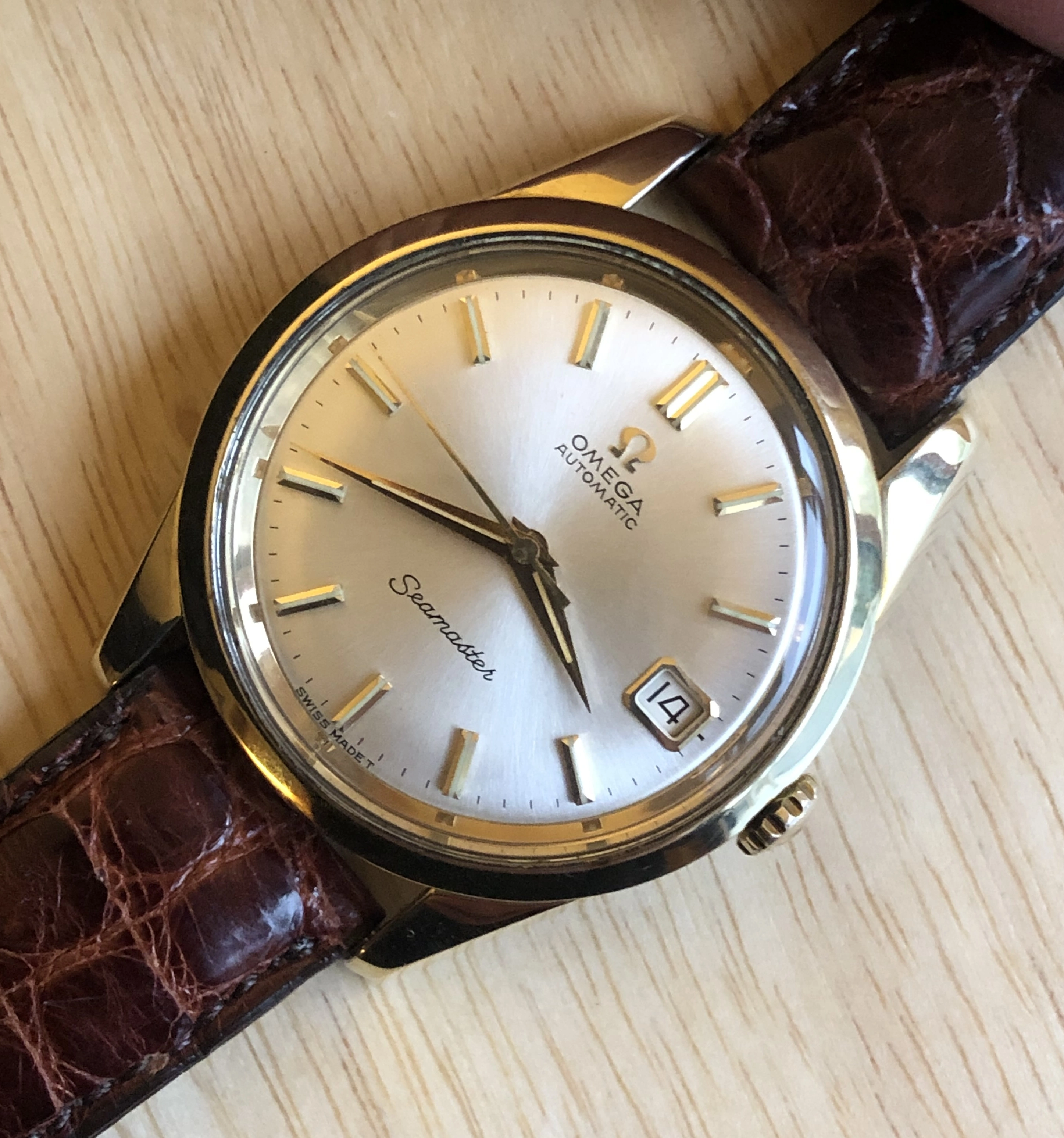 Here is a beautiful Omega Seamaster (ref 166.010) from the mid-1960s with a clean silver sunburst dial and a 35mm gold-capped over stainless case. The watch has not been serviced in my possession, but is winding, setting, and running properly. Comes with a lightly worn crocodile strap