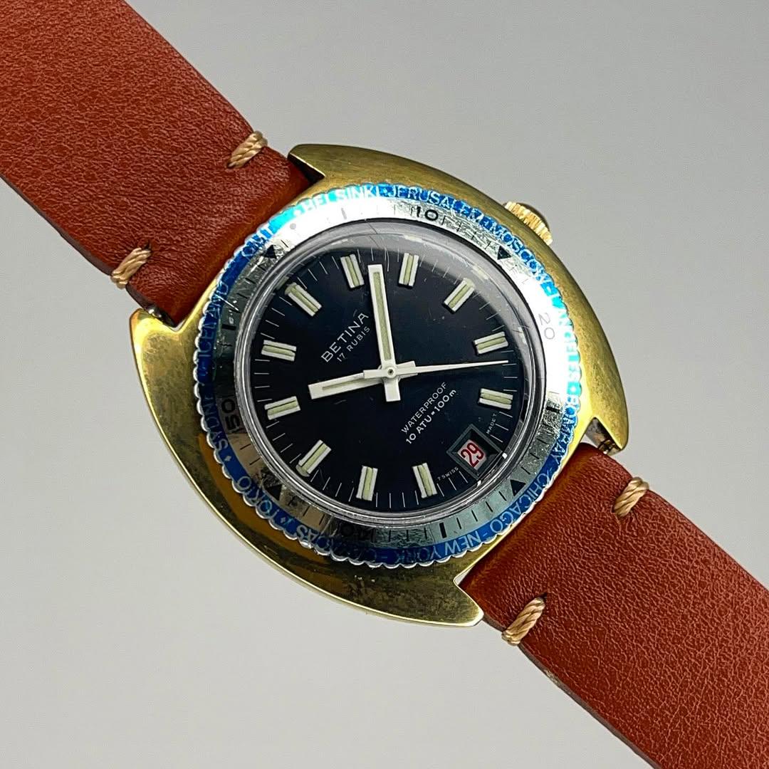 [WTS] Betina UFO Vintage Bronze Divers Watch, Automatic, Super Lume , 40mm, $230 SHIPPED !!! 🔥 Brand: Betina Model: UFO Bronze Divers Year: 1980-90s(approximately) Movement: Automatic Case material: Bronze Crystal: plexiglass Dial: Black Diameter: 40mm (without crown) Complications: Hours, minutes, seconds, date, double-right bezel. Waterproof: 100m Set: only watch. Condition: Very Good. Perfect timekeeping -5-10sec/day. Serviced in 2023, not polished. New genuine leather strap. Please review the images provided. SHIPPING: Free WORLDWIDE standard shipped tracked from Ukraine Shipping to the USA: 1.5-3 weeks to the buyer’s door by UPS/EMS/USPS. Shipping to Europe: 7-15 days. For other countries, please specify in private messages. Payment: The price is indicated in Crypto USDT/USDC , but if you want alternative payment sources then PayPal FF(+2%) Price: 230 USDT/USDC TIMESTAMP and ALBUM with more photos: https://imgur.com/a/bcpzOuK