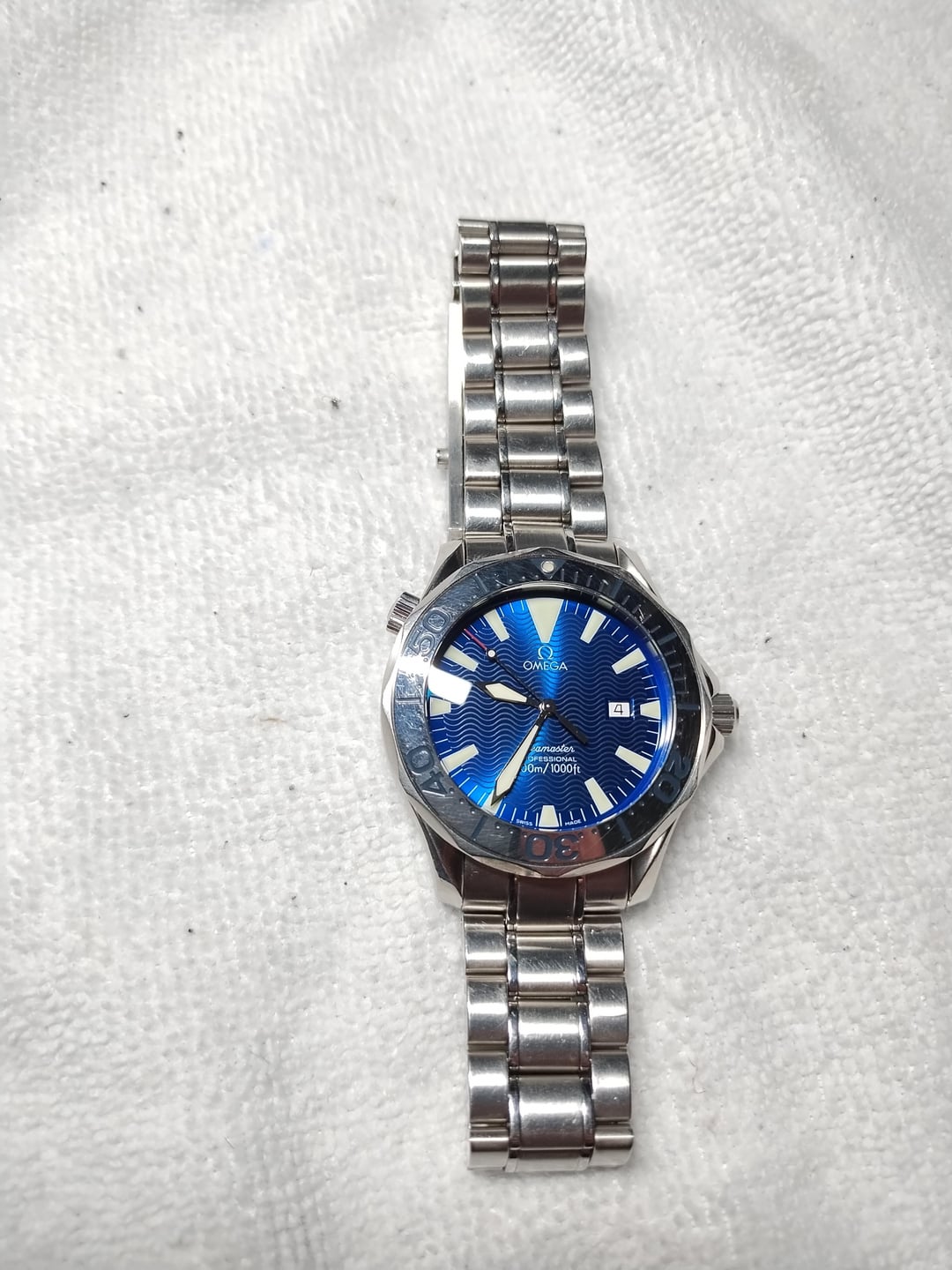 This is an Omega Seamaster Electric Blue Quartz watch. I love this piece, but I find its design a bit dressy for my tastes and have decided to move it on. The electric blue dial is particularly unique and stunning. The watch functions perfectly. The crowns are smooth and tight. Bezel action is great. **Specs:** 41 mm, Blue, Domed anti‑reflective, scratch‑resistant sapphire crystal, 30 bar (300 metres / 1000 feet), Omega 1538, Stainless steel. **Condition**: Overall very good for its age. Watch head 9/10- has bezel scratching that is typical with these models, crystal is clean, finishing is factory on sides of case. Omega symbols are very clear on the crowns. Bracelet 8/10- Again it is very clean for its age. Please refer to pictures for condition. **Kit/working condition**\- Come with hangtag, warranty information in Japanese, extra links and pins. Operating instruction. These are difficult to find with original kit and the reason i bought this one was for condition and kit. **Price:** $1550 **Paypal FF or GS,** If GS buyer covers fees. Shipping included. Feel free to reach out with any questions.