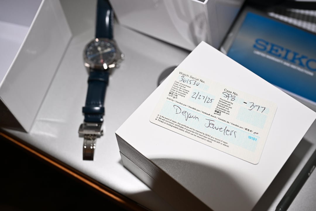 Up for sale is my Seiko SPB-377, purchased in February of this year Watch has been worn periodically. Purchased from AD with warranty card dated 2/25. Comes with watch, OEM strap, box, warranty card with AD stamp. Selling as I happened upon another blue watch this month as a gift and I have way too much blue, this is now for sale. The watch case has some marks from strap changes on the posterior side, otherwise is very clean. Crystal is perfect. I attempted to emphasize (make more visible than is normally the case) any scratches via a flash so you can see exactly where there is any wear. Overall it looks perfect on the wrist. Reference Number: SPB-377 Condition: Used, some minor blemishes on case as shown. Price: $900 shipped and insured, or best offer Trades: Not at this time Payment: Zelle preferred. I have also accepted venmo friends/family after discussing with buyer and confirming ID/history of safe transactions Happy to do a facetime/call to show the watch and answer any questions. Please see my transaction history here. Thanks for looking! Timestamp: [https://imgur.com/a/8X3DAor](https://imgur.com/a/8X3DAor)