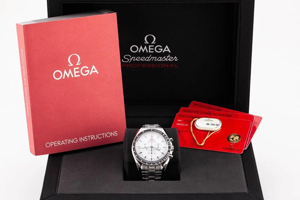 Up for sale is a brand new Omega Speedmaster Moonwatch Professional White Dial Sapphire on Bracelet, reference # 310.30.42.50.04.001 It comes complete with all boxes, papers, booklets, hang tag and Omega Warranty Card dated April 2025.