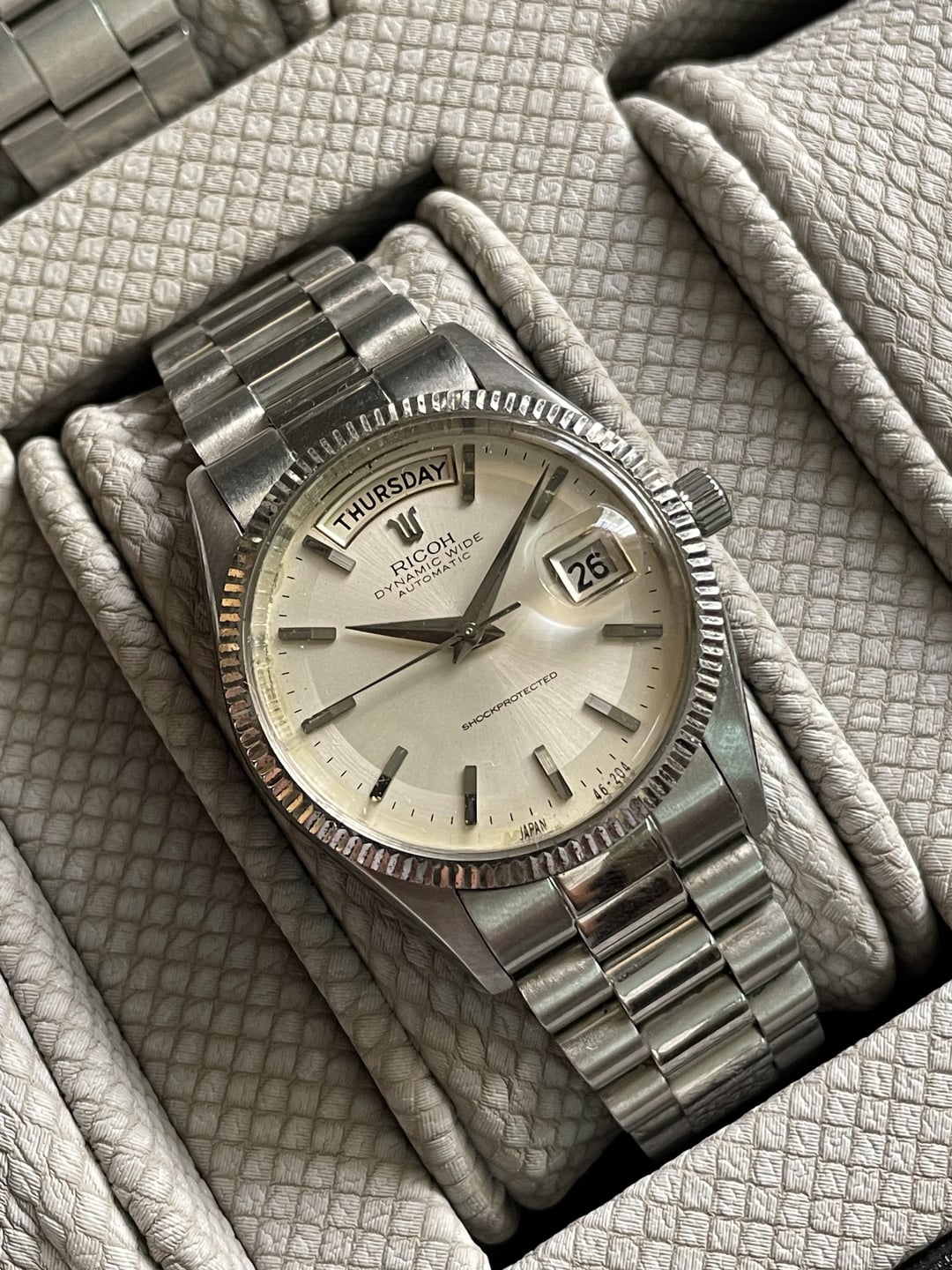 Up for sale is a Japanese-made Ricoh automatic, known as the Dynamic Wide, featuring a classic presidential-style design that adds a vintage touch. The watch runs on an automatic movement and is housed in an approximately 37mm case. It comes attached to its original bracelet, which fits wrists up to approximately 7.2–7.3 inches. The watch also features a day/date window and is running perfectly fine. It is in good condition,polished with light signs of wear. Asking price includes shipping via FedEx. Payment accepted through PayPal Friends & Family, Zelle, or wire transfer. Please note that the watch is scheduled to ship within 2–3 days of payment.