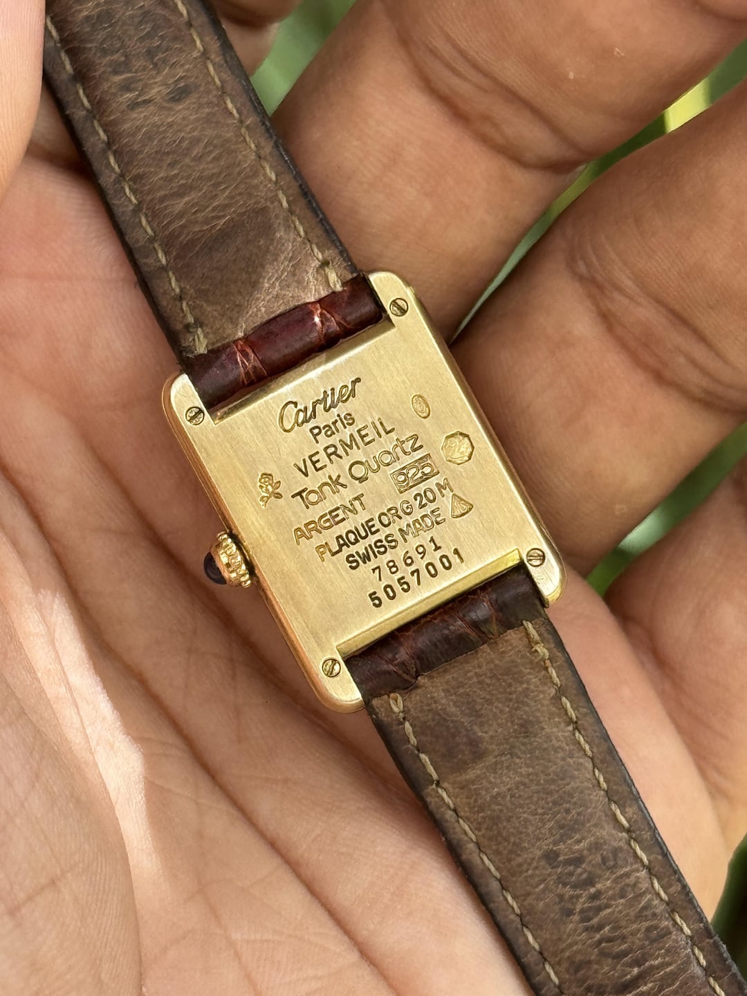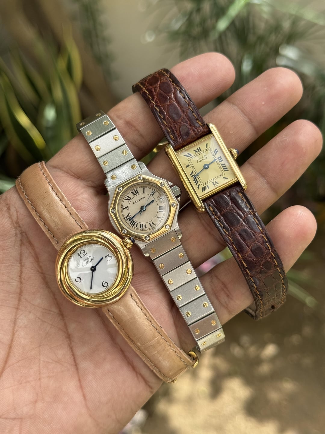 One of the most iconic watch brands for women Cartier has produced plenty of timeless pieces over years. Here we have three options circa 1990s 1. Cartier Trinity Ref. 2735 Approx 27mm gold plated silver case with a sapphire crystal. The watch features a unique case design with a white 3-6-9 dial. Powered by a quartz movement, the watch comes on its original leather strap with deployment clasp. The watch is in good condition for its age, does show light signs of wear. Price: 1475$ through wise / Zelle / usdt 2. Cartier Santos Octagon A 25mm case size, the Santos Octagon reference 187903 comes in a steel and gold case with an iconic roman numerals dial. Sapphire crystal on top, and powered by a quartz movement. Overall good condition with some signs of wear. Price: 1475$ through Zelle/ wise / usdt 3. Cartier Tank Must A stunning lemon dial tank must with dimensions of approx 20x28mm, the reference 5057001 comes in a gold plated silver case. Roman dial with blued hands. Comes on its original strap and buckle which shows wear but has some life left. Overall nice condition for its age. Price: 1225$ through wise / Zelle / usdt Fedex conus shipping.