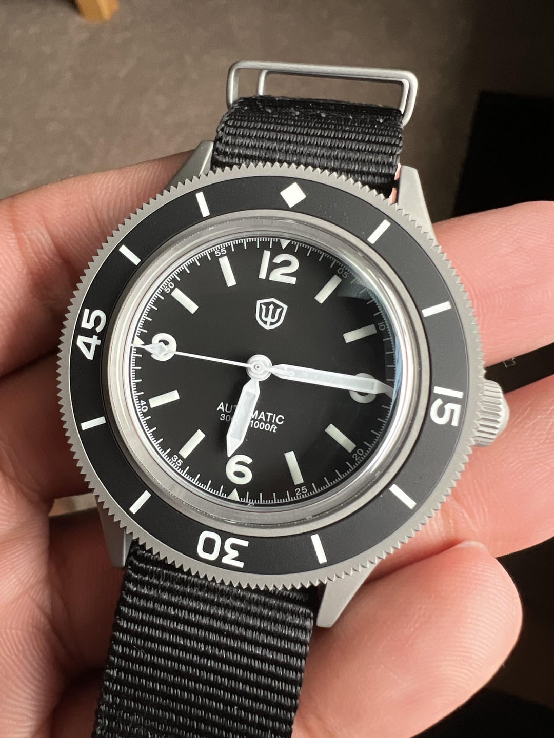 Hey all! Today I have WatchDives homage to one of Blancpains greatest pieces! I typically don’t go for these, but ever since Swatch released their 50 fathoms I had an increased interest in the whole 50 fathoms/Aqualung collection from Blancpain. However, if you know anything about Blancpain, they only release more wearable cases once in a blue moon—and they never really returned to the OG Aqualung look. On top of that a vintage Aqualung is useless in the water (even if I serviced it), and I don’t want to risk it becoming a 20k paperweight. In comes this! It’s about what you’d expect from WatchDives and the like. Sapphire, NH38 (no ghost date), 300m water resist, fully lumed ceramic bezel, and tons of BGW9. Accuracy wise it’s running at +1 sec/day! It wears and feels great. The case seems to be a bead blasted, or some sort of blasted-looking finish. The bezel is 120 click with very nice resistance and action. Overall, it’s a great little watch! Condition Nothing much to say other than it’s new! No marks, only really tried on for like an hour and then boxed for a couple days. Please feel free to ask any questions! Timestamp + Album: https://imgur.com/a/325oB8b Price: $120 * Shipping: Included for U.S. buyers. International shipping available at additional cost. * Payment: PayPal F&F or G&S (+4%), Zelle, or bank wire accepted. * Trades: Shoot me some offers! I am considering some Omega and Grand Seiko’s and others! You can also find me on Instagram at @rgxhermes.