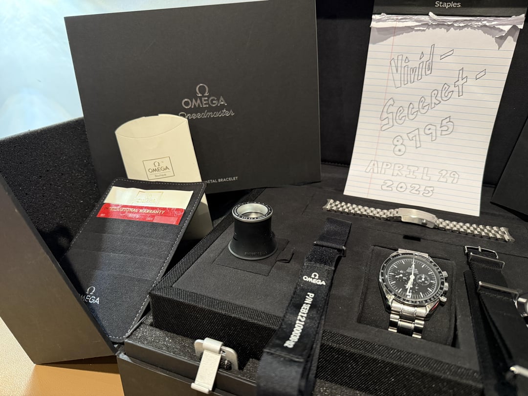 For Sale 311.304.230.01005 2017 Omega Speedmaster Moonwatch With Haselite crystal/ comes with Sapphire crystal exhibition back cover* Original caseback included Also included is a 3861 Brushed Bracelet with comfort clasp (full links). Original bracelet included also full links. 1 card included * original warranty card matching serial numbers. FaceTime / Video verification Available Zelle or Venmo Payment only No trades at this time $4️⃣4️⃣0️⃣0️⃣ Priced to sell FYI….I am not willing to separate the bracelet from this package at this time.