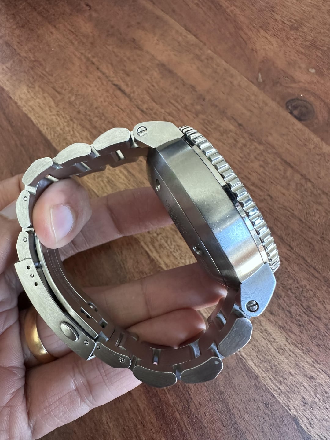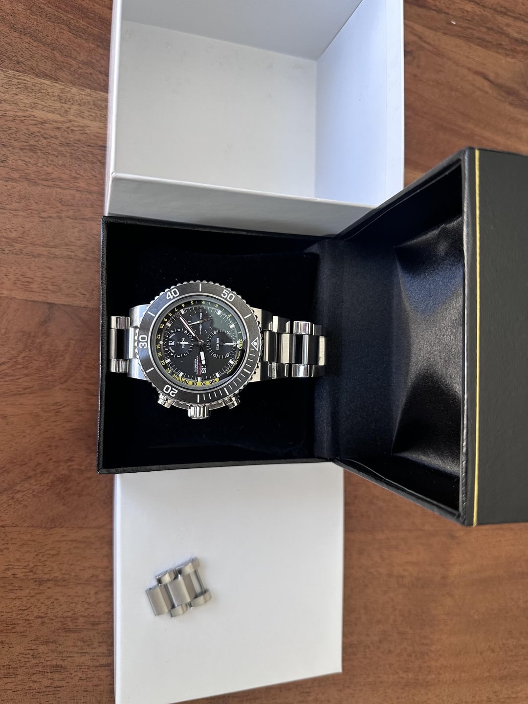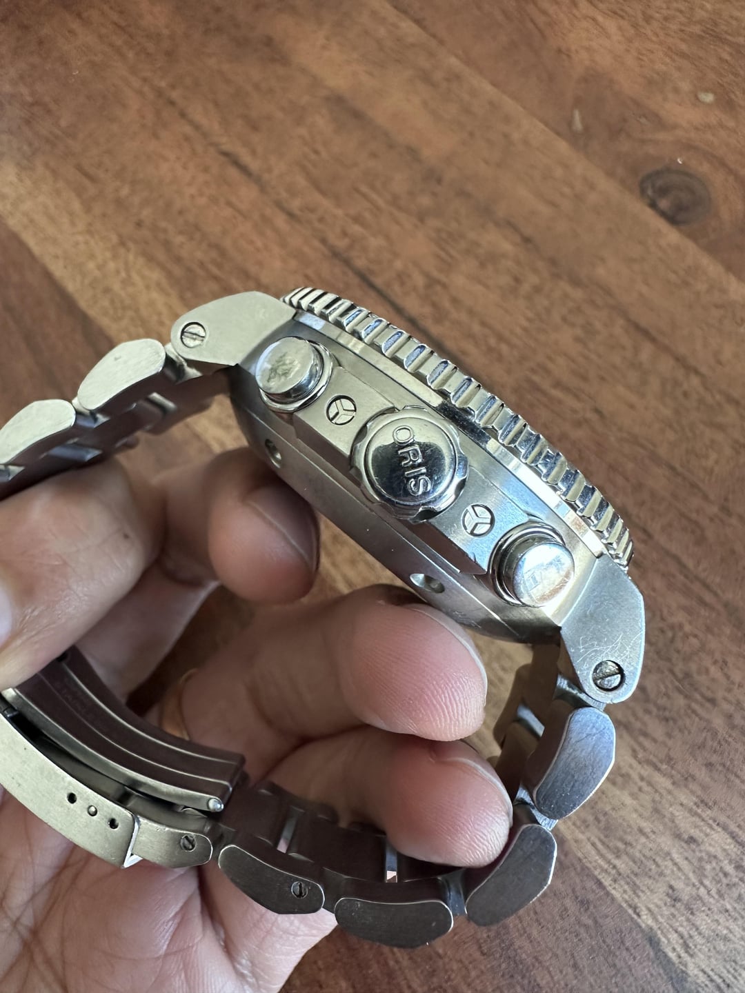Up for sale is my Oris Depth Gauge Chronograph. The watch keeps great time. It shows wear with scuffs all over including bezel and crystal. I have tried to capture this in the pictures. That said there are no dents or deep scratches. The watch is currently sized for 7.25” wrist with one extra link. Watch only. Not sure of age and service history. Looking to sell for $1,800 including shipping (not including insurance) within continental US. Will accept Zelle, Venmo, or PayPal F&F. Not looking to trade. Will not respond to low ballers. Please let me know if you have any questions.