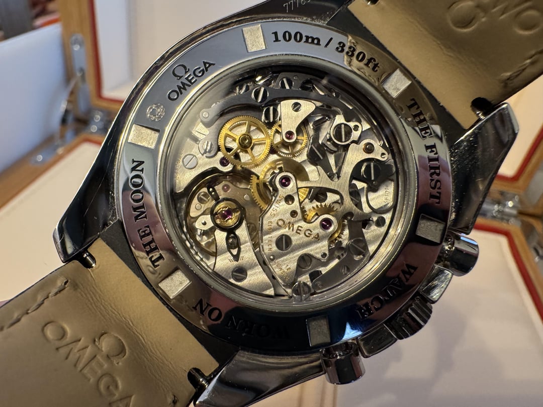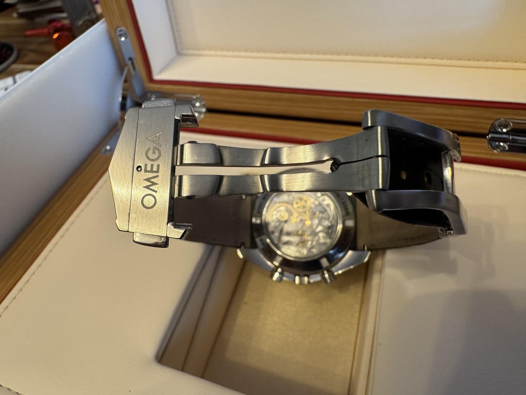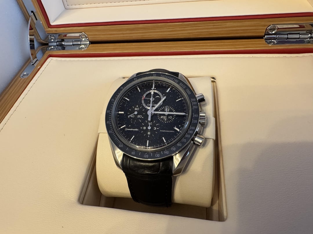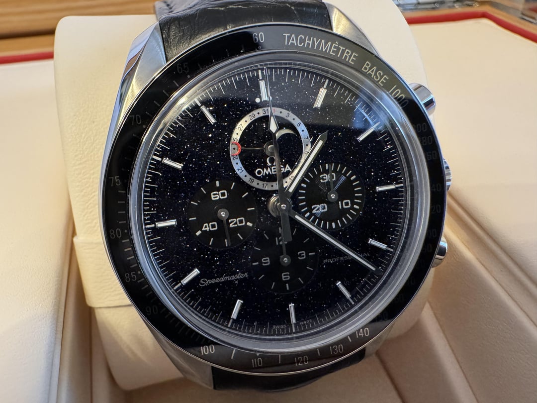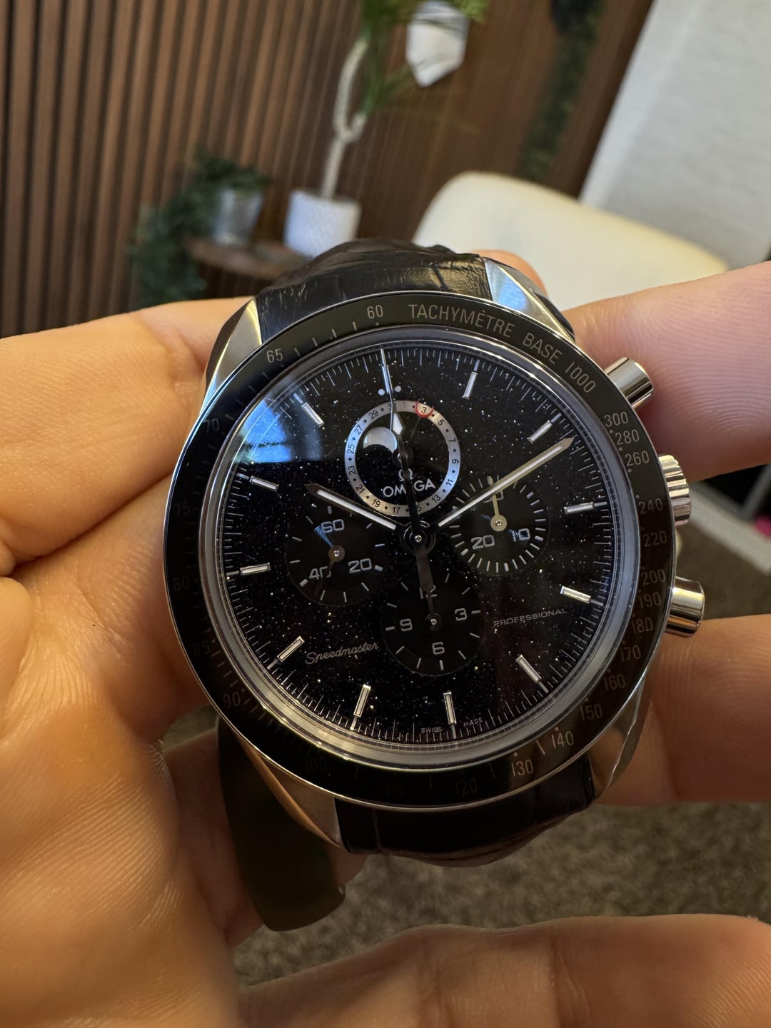 Omega Speedmaster Aventurine Date & Moonphase! 🌖 Ref. 311.33.44.32.01.001 Selling a beautiful Omega Aventurine Moonphase. If you havent seen this watch in person, it is truly amazing and that aventurine dial is like staring into the night sky! The watch just returned from service through Omega on 10/2024. It received a full service, a brand new Aventurine dial, and new white gold hands. I also purchase a brand new OEM strap and clasp for this exact model so it looks like it did the day it was released and I have all the receipts. The watch comes with the newer oak color case that has the red removal travel case. The watch does not have the original red cards, but as stated it was serviced fully through Omega and has the paperwork and spare parts that they removed. While there are some of these out there trading hands, they aren’t as nice as this one and are typically found with aftermarket straps and clasp. Feel free to reach out, happy to do a FaceTime with the watch. $9650 and located in the US