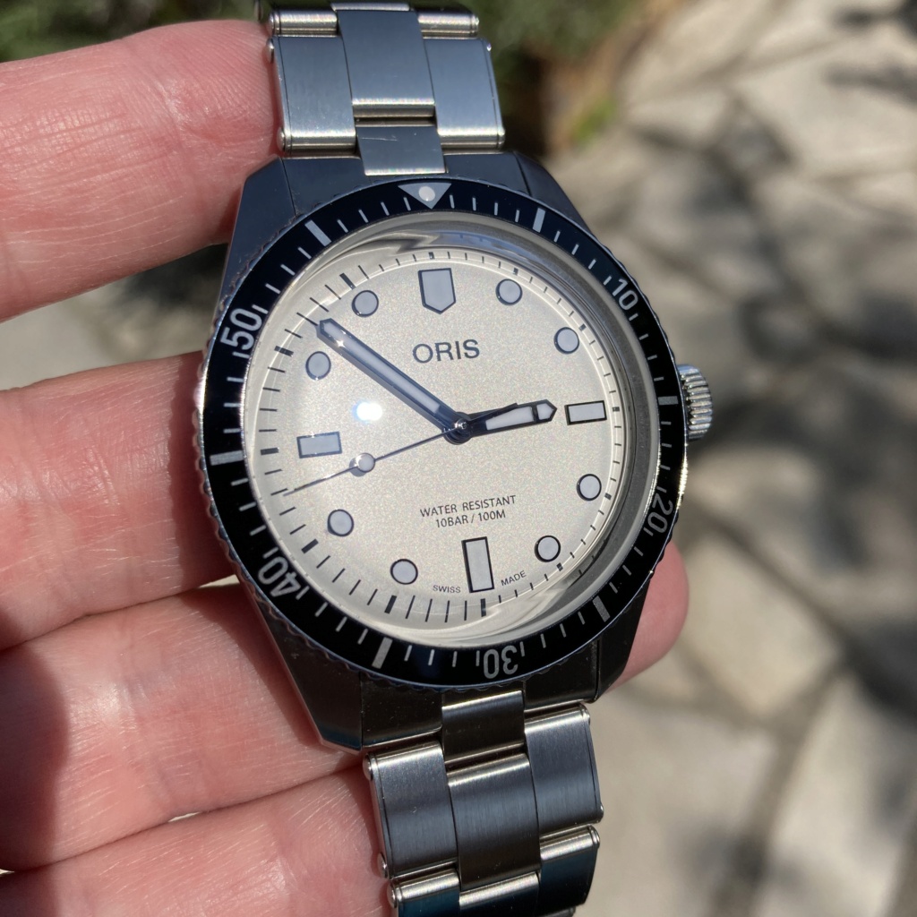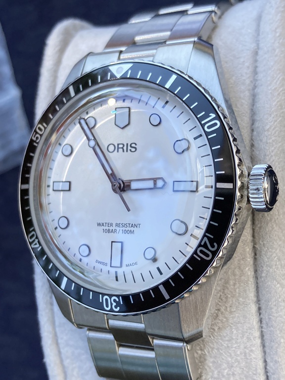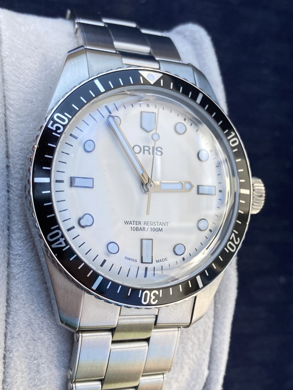 Je vends ma Oris Skindiver 1965 de 2023, version Oris Social Club Paris, édition limitée. 40mm, mouvement 733 (base Sellita top grade), très précise. Le cadran est très beau : blanc très très légèrement pailleté argent : ce qui donne un effet splendide sous la lumière du soleil ( voir mes photos). Les aiguilles et index sont en acier parkérisé/bruni du plus bel effet.