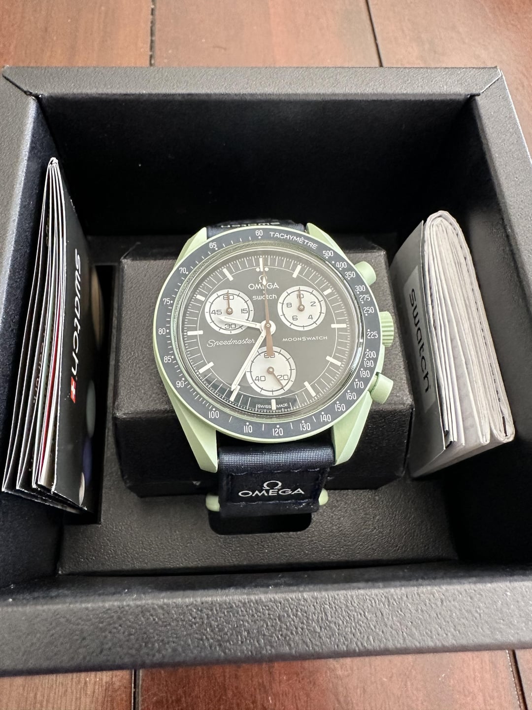 Selling this Omega x Swatch MoonSwatch "Mission on Earth." Recently bought it from another user on this sub and found out it didn't fit me. Just looking to more or less make my money back, so I'm asking the same **$200—shipping to CONUS included**—that I paid. In working order, only worn by me for about 5 minutes total. At the recommendation of other MoonSwatch owners, I did add an aftermarket protector for the crystal that is easily removable if you don't want it. I did not notice any cosmetic issues with the watch. It's a great piece, but I partially liked it for the strap it comes on and that strap doesn't fit me at all. EDIT TO ADD: Also includes originally warranty card. Warranty is good until April 2026.