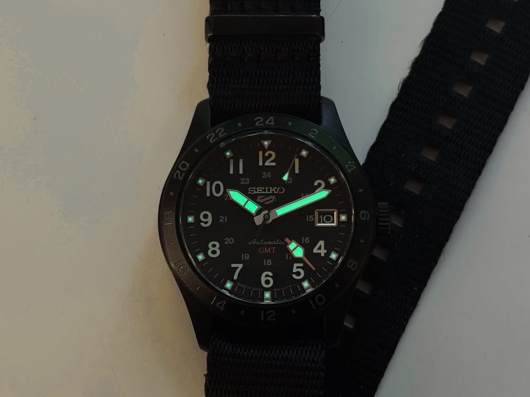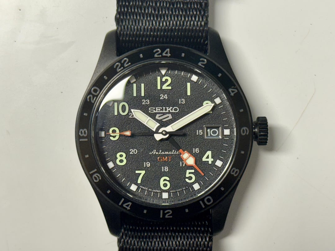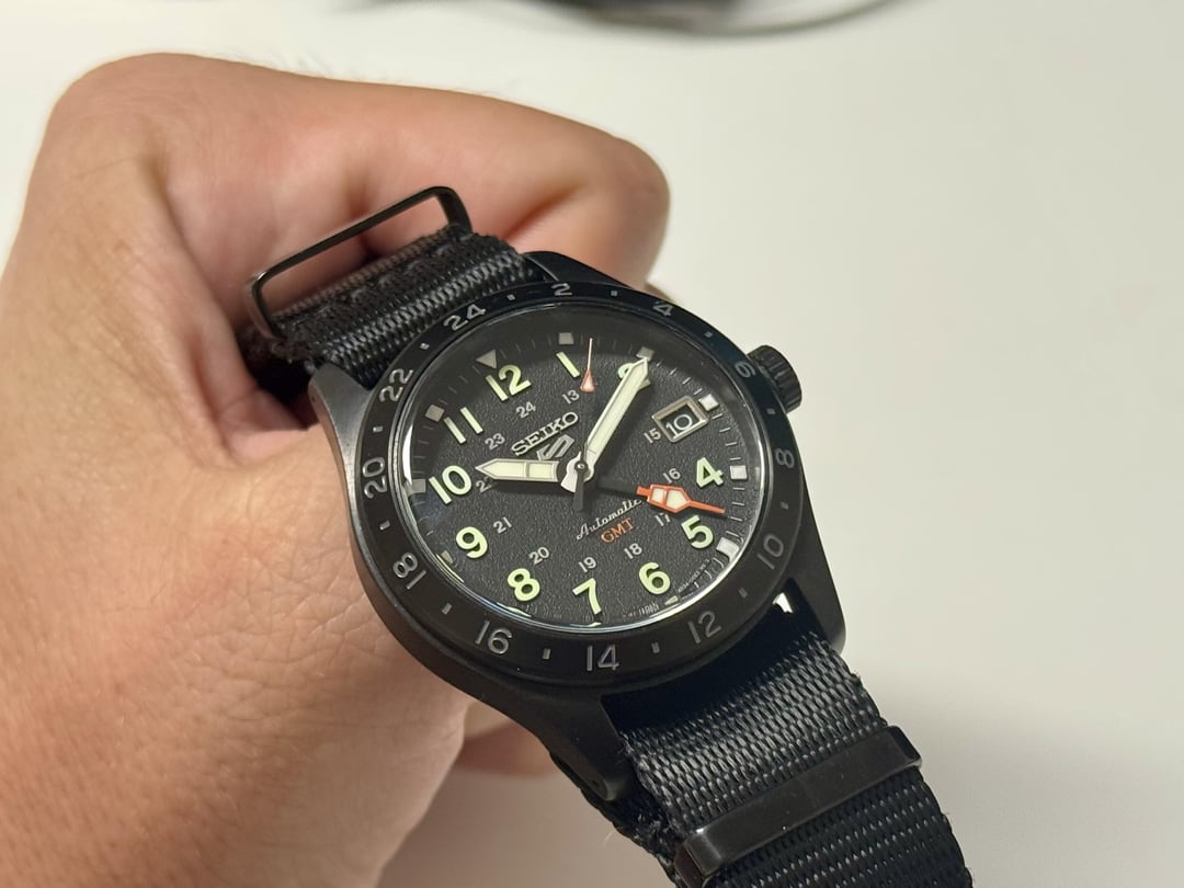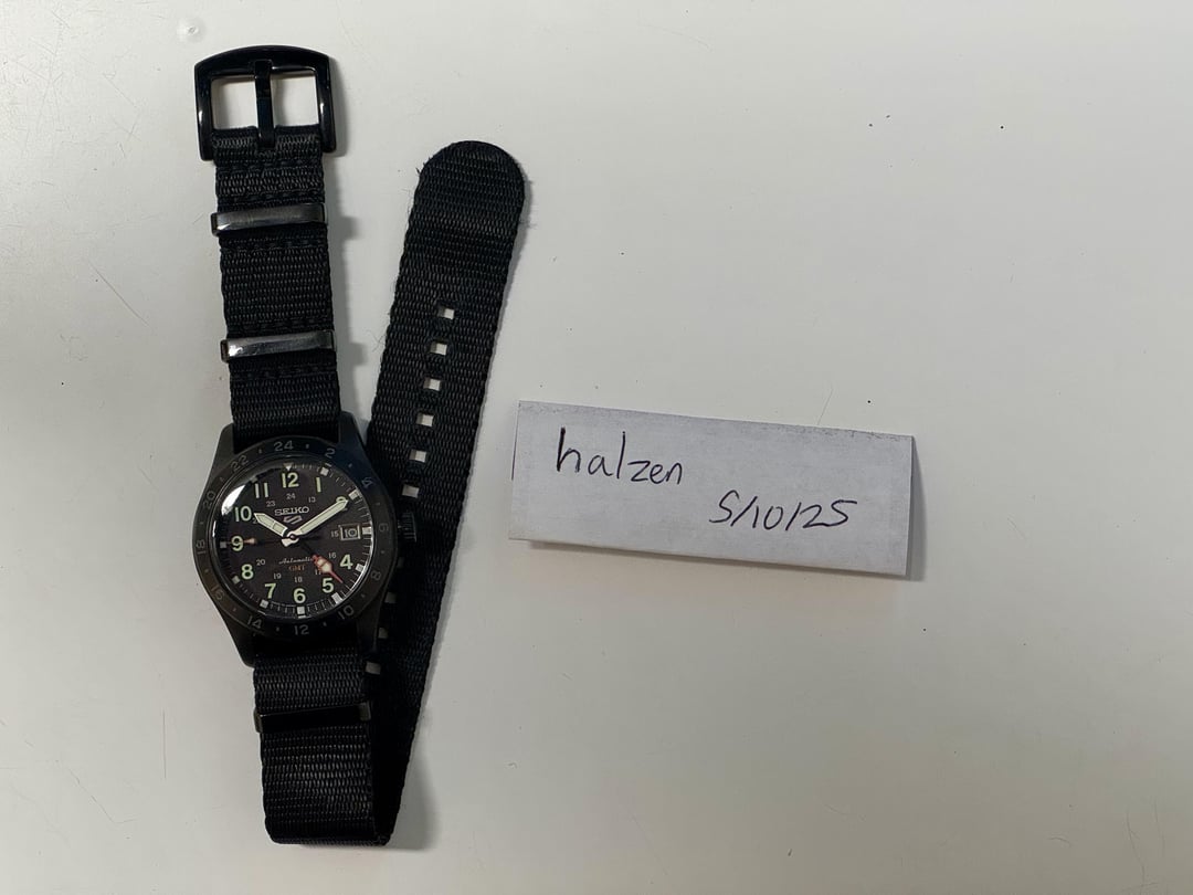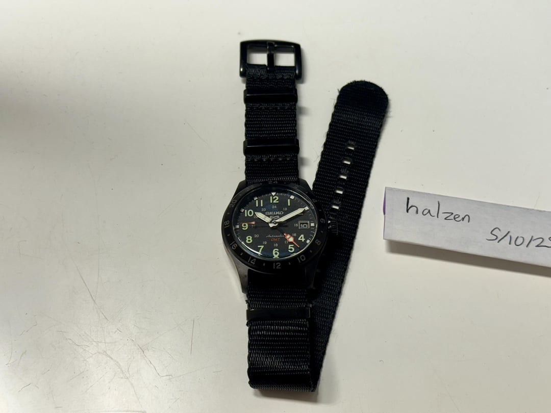 Beautiful Seiko 5 GMT watch. I love every detail from the glass to the raised numerals and how well the lume works, but I'm not wearing this as often as my other Seikos for some reason. Some quick specs: - Caliber: 4R34 (automatic with manual winding, 41 hours power reserve) - 39.4mm x 13.6mm case, 47.9mm lug to lug, 20mm lugs - Cheap aftermarket NATO strap, lost the original box, papers, and strap - Gently used condition Price: $200 shipped in CONUS, PayPal G&S preferred