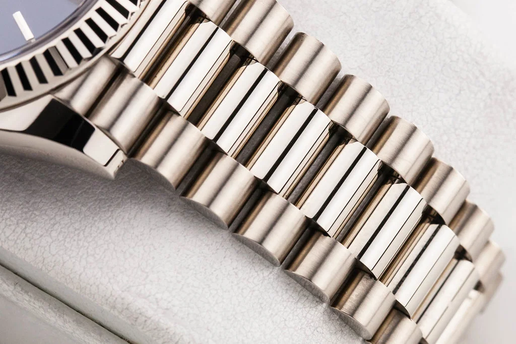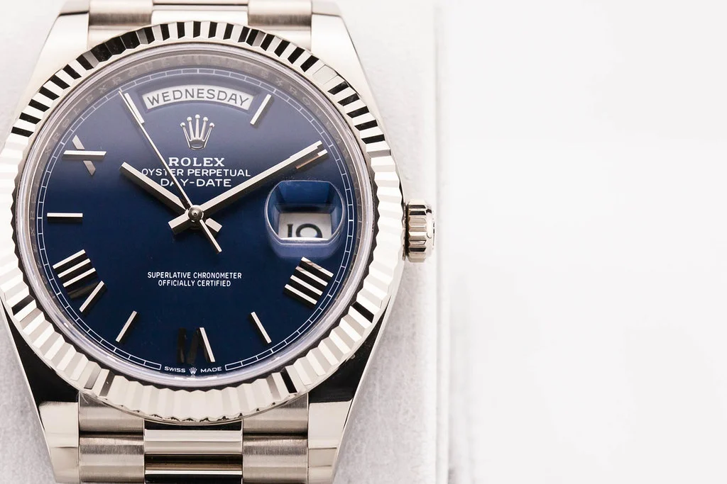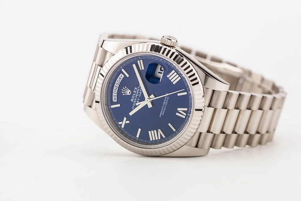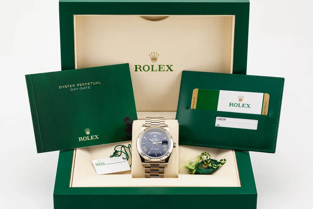 Up for sale is an excellent condition Rolex Day-Date 40mm White Gold Blue Dial with Fluted Bezel on President Bracelet, reference # 228239 It comes complete with all boxes, papers, booklets, hang tags, and Rolex Warranty Card dated June 2020.