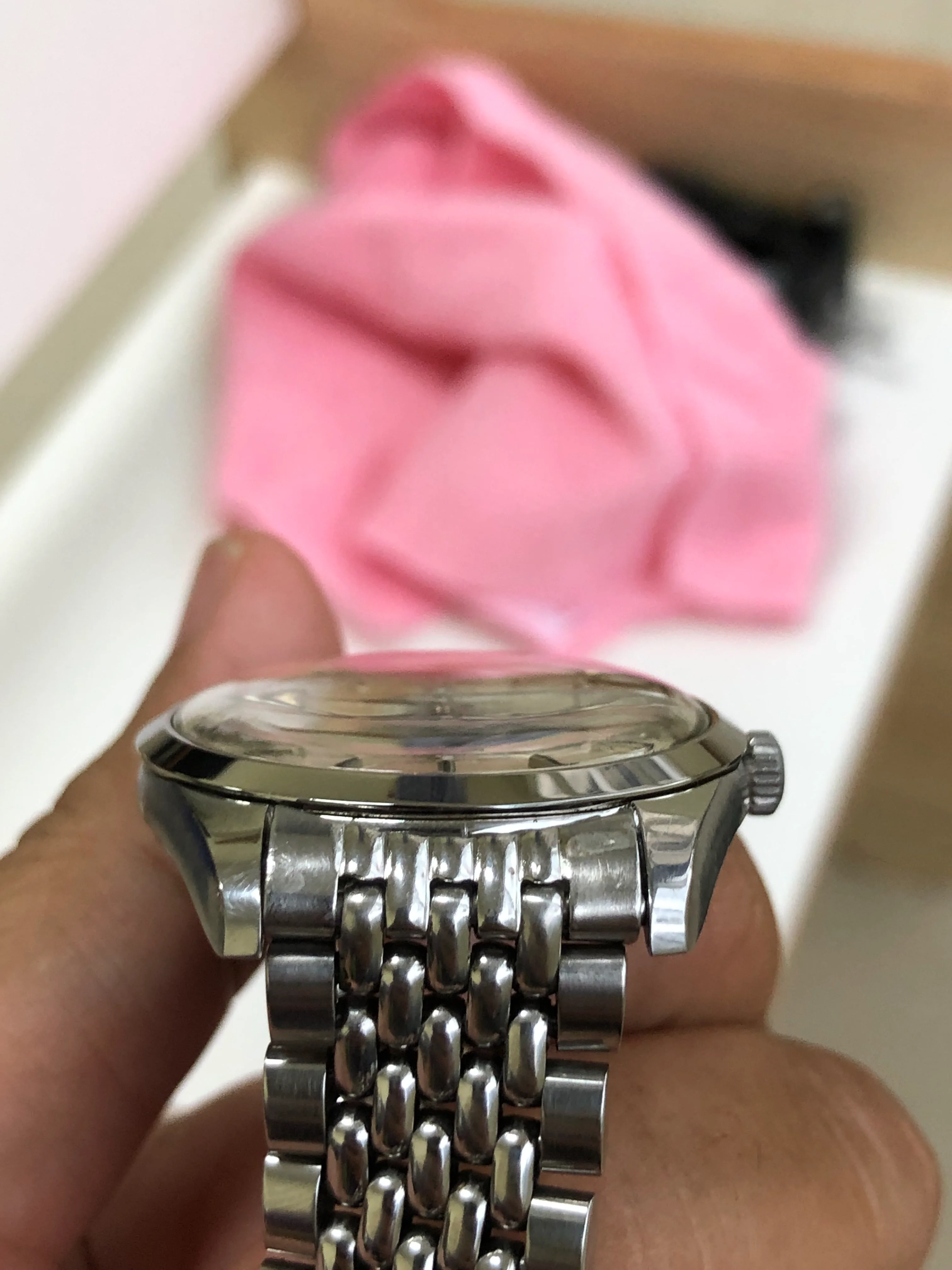 - Dial: Original white sunburst dial in good condition (several hairlines scratches around the center that are nearly invisible to naked eyes), black onyx inserted hour markers; dauphine hands; faceted date-aperture frame; prints, hands, hour markers are all good.