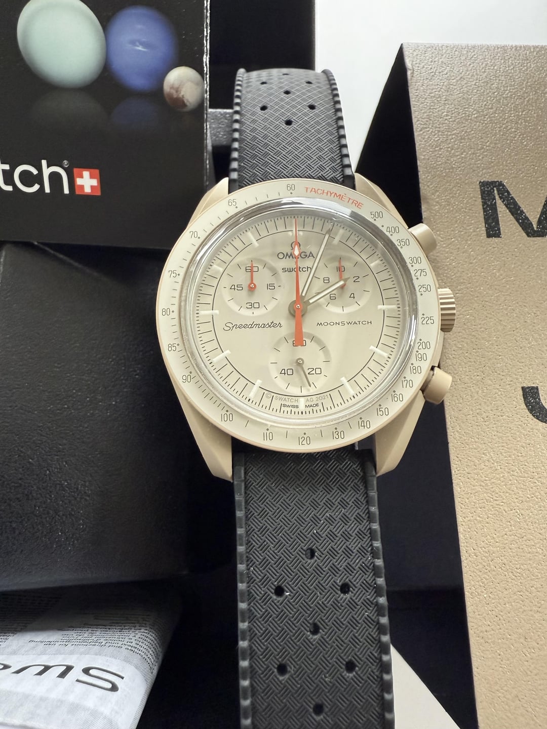 Hi there, I’m looking to sell my Mission to Jupiter Moonswatch, it is in excellent condition and very lightly used. It’s only ever been worn with a screen protector applied, so any marks you see in the photos aren’t on the face. Asking- $235 shipped (plus G&S fees) CONUS only Willing to accept PayPal or PayPal G&S (if G&S I would strongly prefer a buyer with transaction in this sub). No transactions here, but I do have a confirmed sale in r/fragranceswap. Including both the OEM strap, a rubber strap from Amazon, as well as an extra screen protector. Also I have full box and papers as seen in the pics (covered the serial number on the warranty- not sure if it’s advised to have it show in pics). Previously posted on 5/7/25- price reduced.