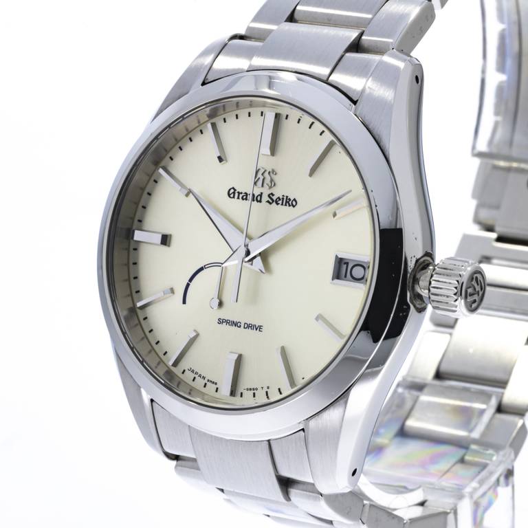 Pre-owned in very good condition Grand Seiko Heritage Collection 39 mm stainless steel case , screw case back, deep silver finish dial with a radial sheen, shaped raised indices, power reserve display at 8 o'clock, dual curved sapphire crystal with anti-reflective coating on the inner surface, spring drive movement which combines the motive force of a mainspring with the high precision of a quartz watch, caliber 9R65, 30 jewels, with an accuracy of ± 15 seconds per month, approximately 72 hours of power reserve, water resistant to 100 meters, on a stainless steel bracelet with three fold clasp with push button release. This watch is complete with box and papers dated from October 2018