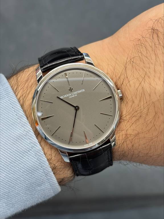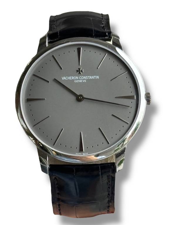 Pre- owned in good condition Vacheron Constantin Patrimony 40mm platinum, slate grey dial with applied white gold indexes hour markers and hands, manual wound mechanical movement,caliber 1400, 40 hours of power reserve, scratch resistant sapphire crystal, solid case back, water resistant to 30 meters, black alligator strap with Platinum tang buckle. This watch doesn't have box or papers.