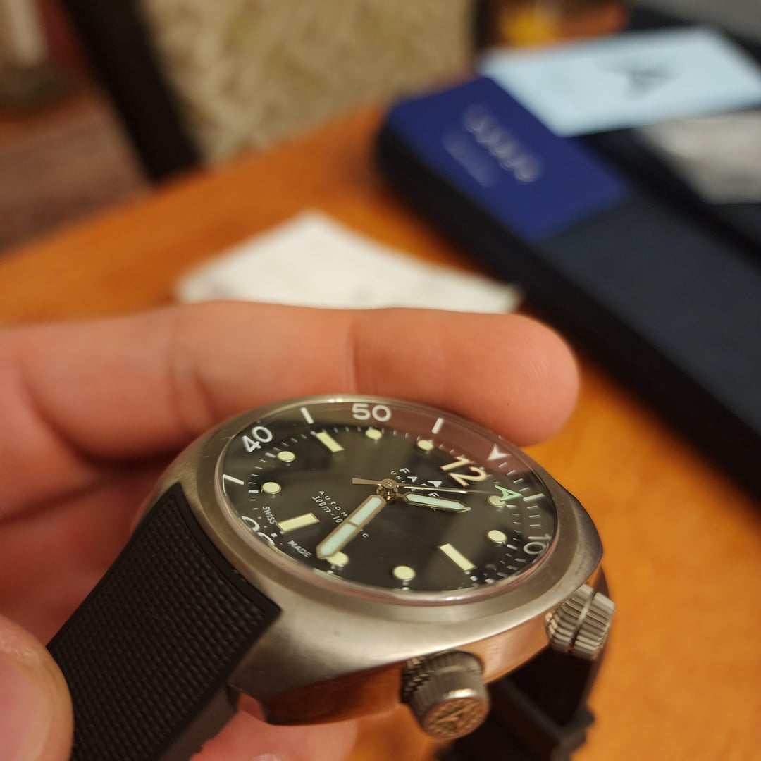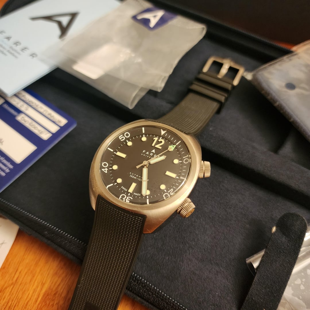 The Farer Endeavour Titanium Series II in Inky Black is a sleek, lightweight compression diver crafted from Grade 2 titanium, offering exceptional durability without the bulk. Designed with a 41mm case and 300m water resistance, it’s built for both deep dives and everyday wear. This particular piece shows light aesthetic wear from regular desk diving, adding a bit of honest charm to its already adventurous look. ^per chatgpt lol. But it is in vgc, and has over 3 years left on the warranty. Im looking to mix things up, retail is 1200 so TV is like 800-900ish range. Happy to add cash or hear offers outside that range. Cash id be looking for more 900ish.