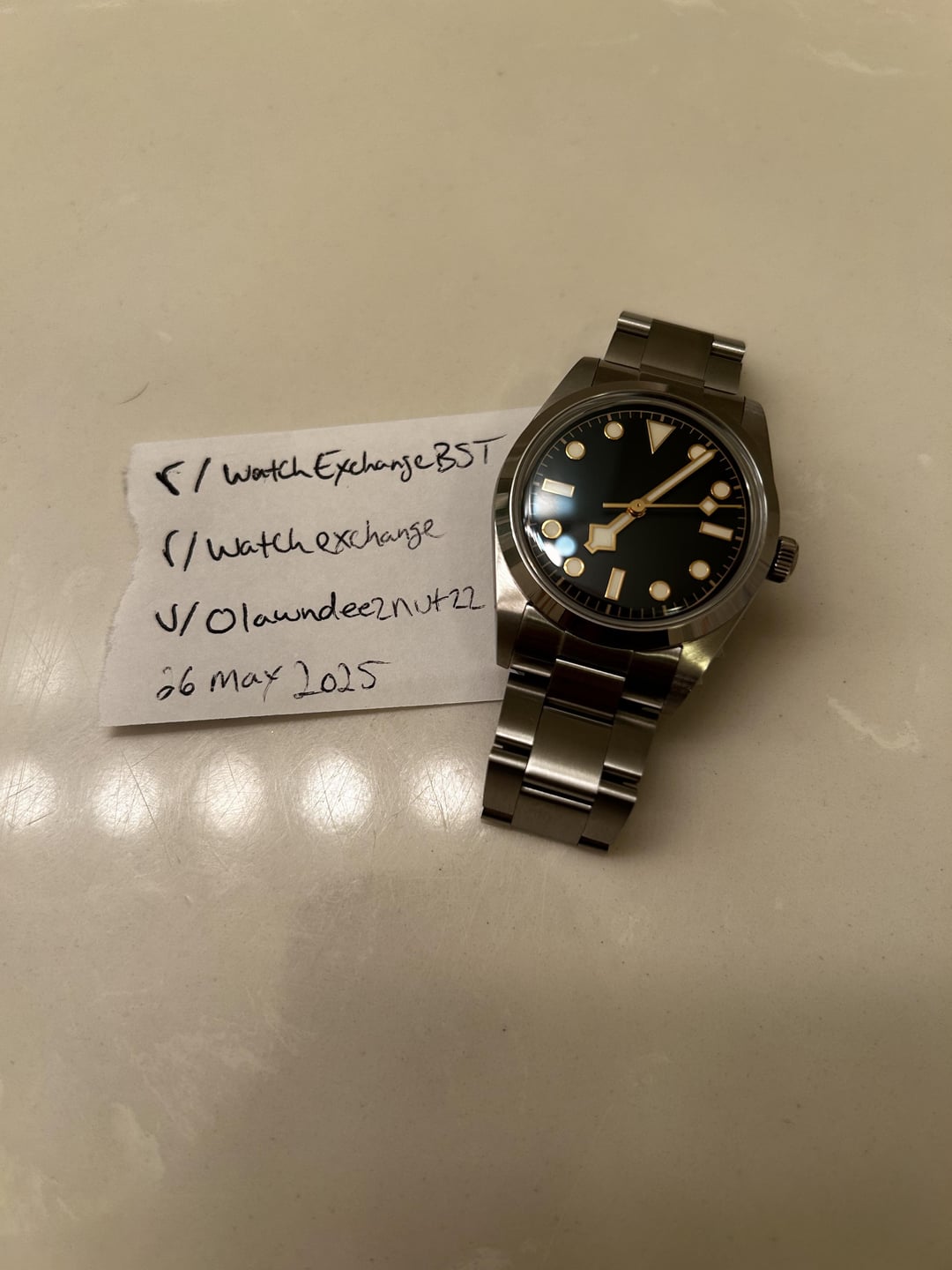 Up for sale is a used SAN MARTIN BB36 with sterile black dial. There are hairline wear marks on case and bracelet but overall good used condition. I bought the watch off another user on Reddit a few days ago but I didn’t like it as much as I thought I would. Asking 100$ shipped! Ref #: SNO21 Case Material : Stainless steel Diameter : 37mm Lug to lug: 45.9mm Thickness: 11.3 Glass: Sapphire crystal Dial: Black sterile with gilt snowflake hands Movement: PT5000