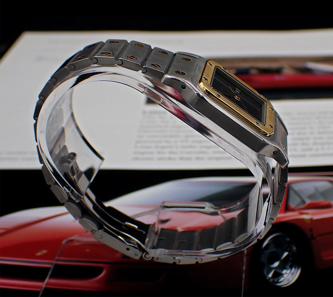 BRACELET: This great Carrée comes on its original semi-integrated first generation bracelet with trademark gold screws set into rectangular satined steel links and Cartier-signed logo clasp. This bracelet is both super tight, as is the snap-in clasp, and super long, presently fitting a 7.5” wrist at what I feel must be its full original length. You can tell it’s first generation by the wide clasp closure and the push pin released, slide-in links. Cosmetically, this beautifully crafted bracelet is in Excellent+ unpolished condition with only minor marks from wear.