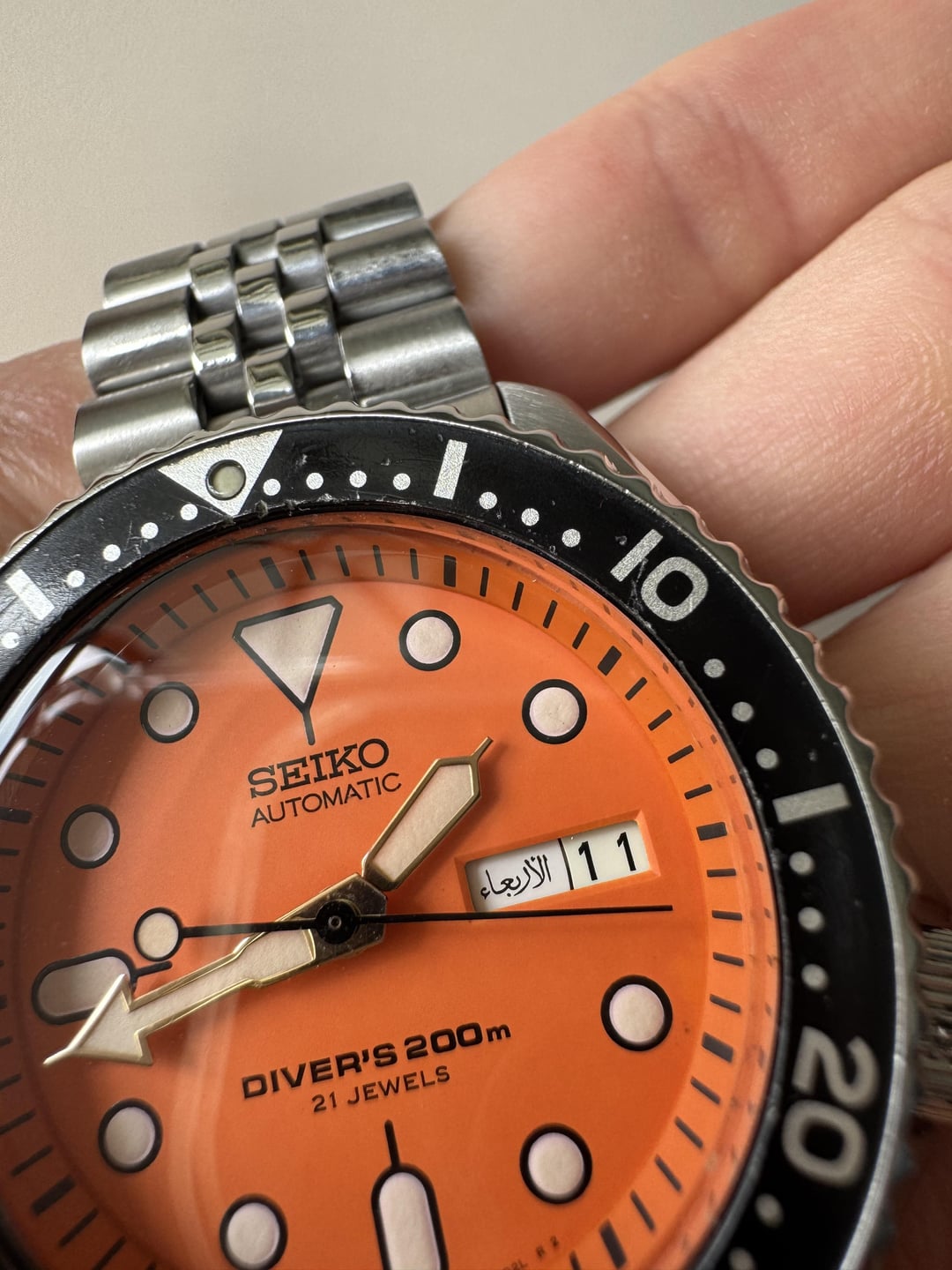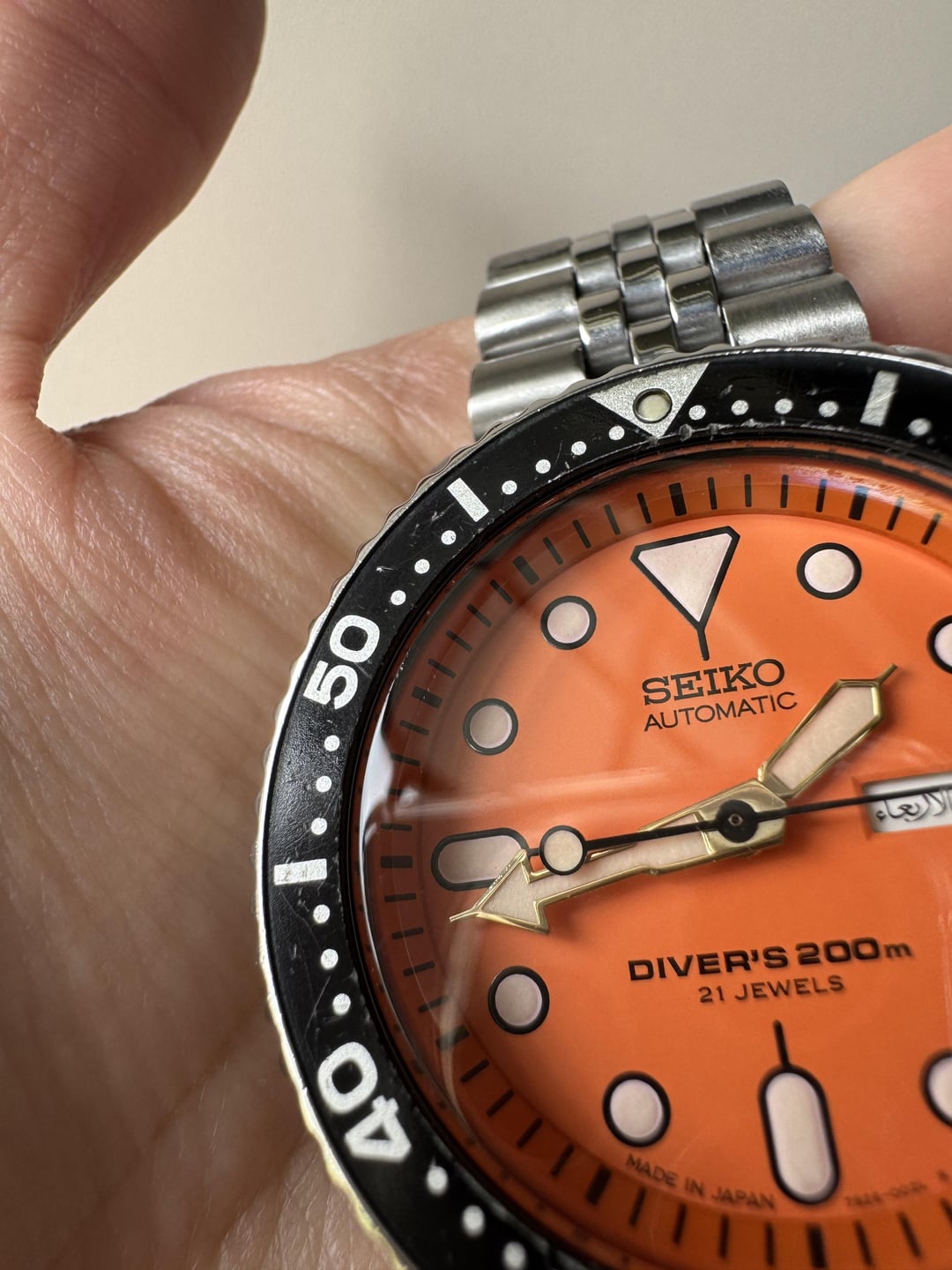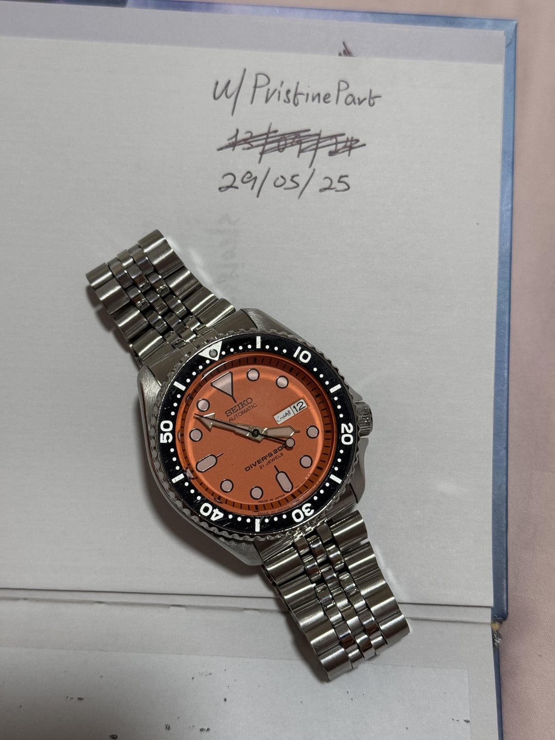 Selling my SKX011J on a new aftermarket Jubilee. All parts are original - no box or papers. 42mm. Movement was serviced at the start of the year; bezel action is decent. Cosmetic damage on insert, nothing serious. You can also expect hairlines on the caseback, lugs and the sides. Dial and hands are in great condition. Arabic secondary day wheel. Not pressure tested, so I don’t even recommend showering with it! Price: $220 + shipping from Singapore $18 for shipping: usually takes 2-3 weeks to USA/Europe/Africa, 1-2 weeks to Asia/Australia. FedEx is available to USA with a top up of $20. Payment methods: Wise / Revolut (no fees), Crypto, PayPal G&S (+4.5%) or PayPal F&F Do comment before starting a chat or sending a PM, cheers!