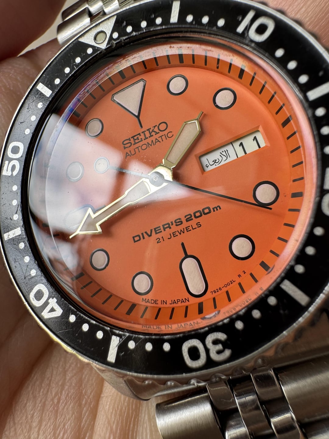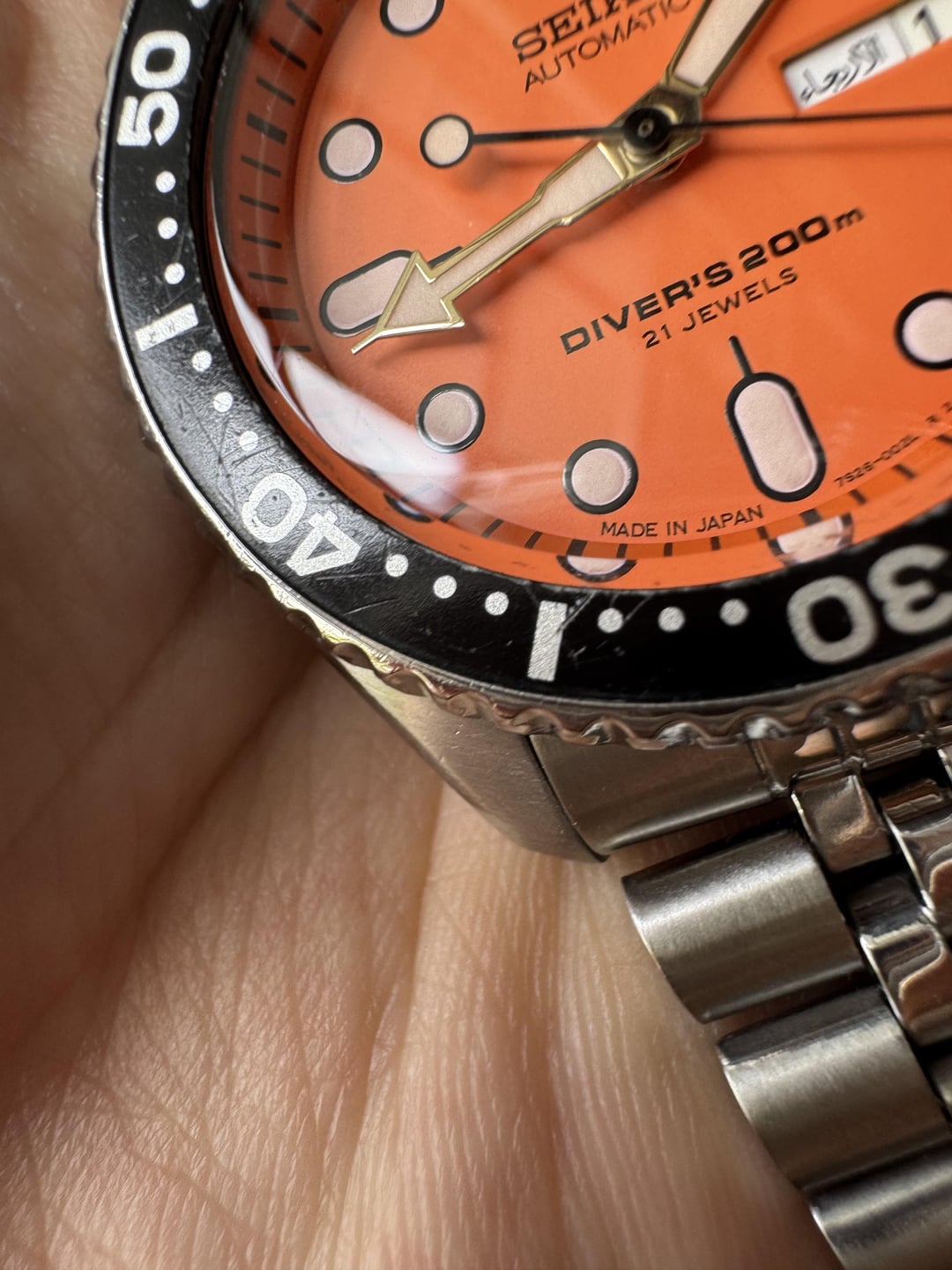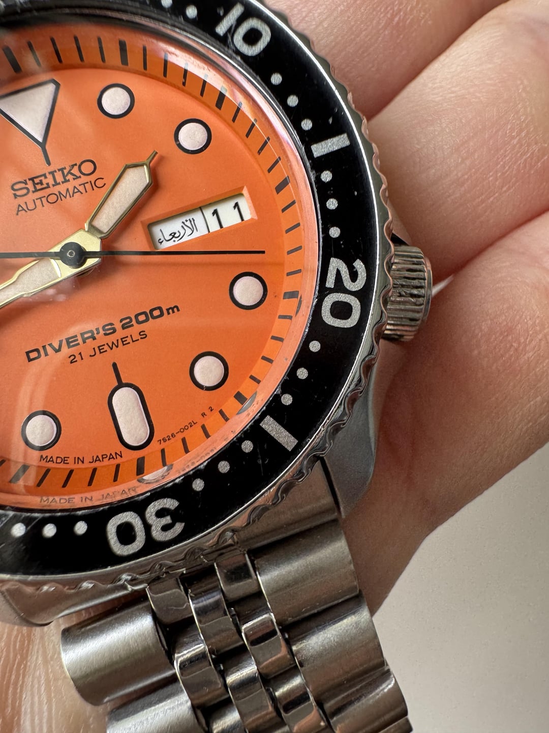 Selling my SKX011J on a new aftermarket Jubilee. All parts are original - no box or papers. 42mm. Movement was serviced at the start of the year; bezel action is decent. Cosmetic damage on insert, nothing serious. You can also expect hairlines on the caseback, lugs and the sides. Dial and hands are in great condition. Arabic secondary day wheel. Not pressure tested, so I don’t even recommend showering with it! Price: $220 + shipping from Singapore $18 for shipping: usually takes 2-3 weeks to USA/Europe/Africa, 1-2 weeks to Asia/Australia. FedEx is available to USA with a top up of $20. Payment methods: Wise / Revolut (no fees), Crypto, PayPal G&S (+4.5%) or PayPal F&F Do comment before starting a chat or sending a PM, cheers!