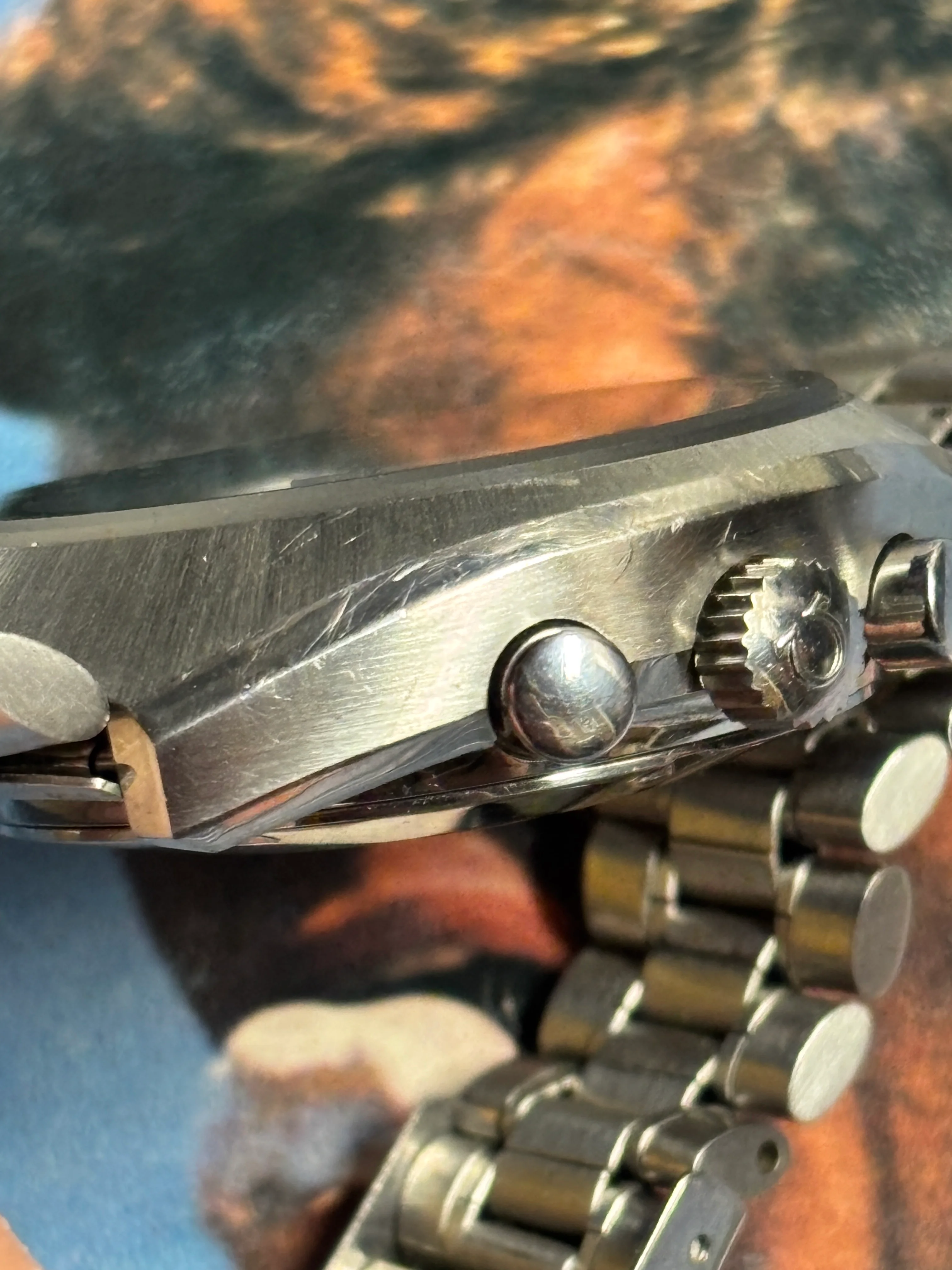 Watch appears to be in all original condition with no evidence of ever being polished or touched up. Case shows hairline scratches and original brushing. Note: due to camera magnification these scratches look worse than to the naked eye. Hands and dial are in great shape with clean and consistent lume. Bracelet has one gouge on the 12 o'clock side as shown in photos. The 861 is running strong on my timing machine, but service history is unknown. All chronograph functions operate and reset properly. Bracelet is sized to my 6.9" wrist, but will include an additional link.