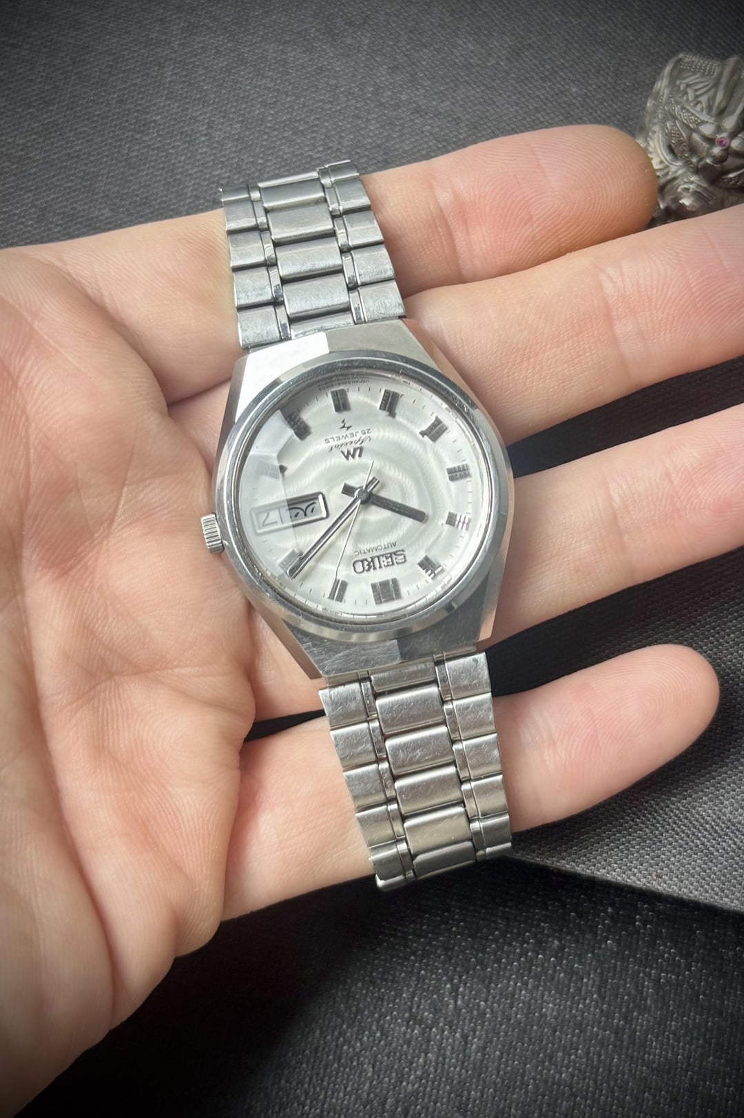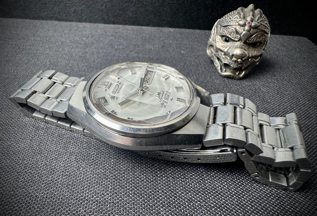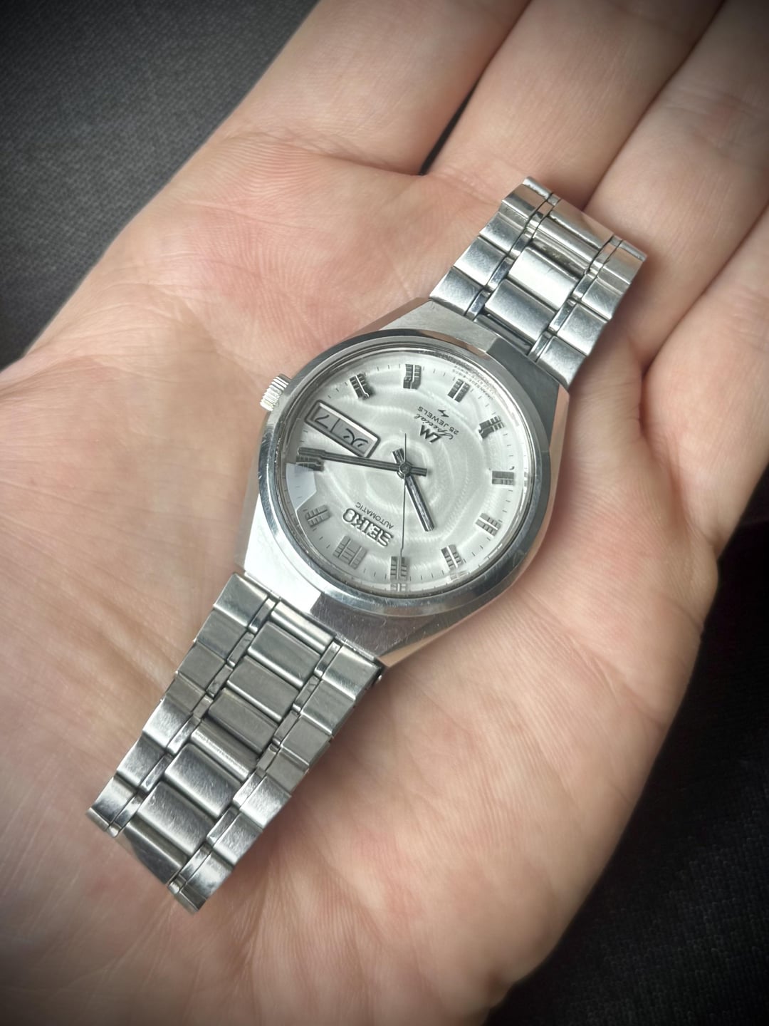 Up for sale is a beautiful Seiko Lord Matic LM Special 5206-6150. Its Hi-Beat movement has been fully serviced. The watch features all original parts, including a beautiful white patterned dial with faceted crystal. 🗓️ May 1973. ⚙️ Cal. 5206A, automatic, 25jewels, 28800 bph. 📐 Size 35mm. 👉 Details: - all original parts. - wonderful white patterned dial in perfect condition. - original faceted crystal in perfect condition. - day/date calendar at 3o’clock, quick set works (English and Japanese kanji). - sharp unpolished ss case. - original ss bracelet. - the watch is fully serviced and runs well. 💶 Price: The price of € 250 includes worldwide shipping. It normally takes 3-5 days for you to receive the watch. 🤝 Payment method: PayPal F&F, Wise, Western Union. 📨 Let’s chat: Additional pictures and videos are available in dm. I invite you to chat with me if you like this watch. 🙏 Please follow my Instagram for more: https://www.instagram.com/gabe_watch/