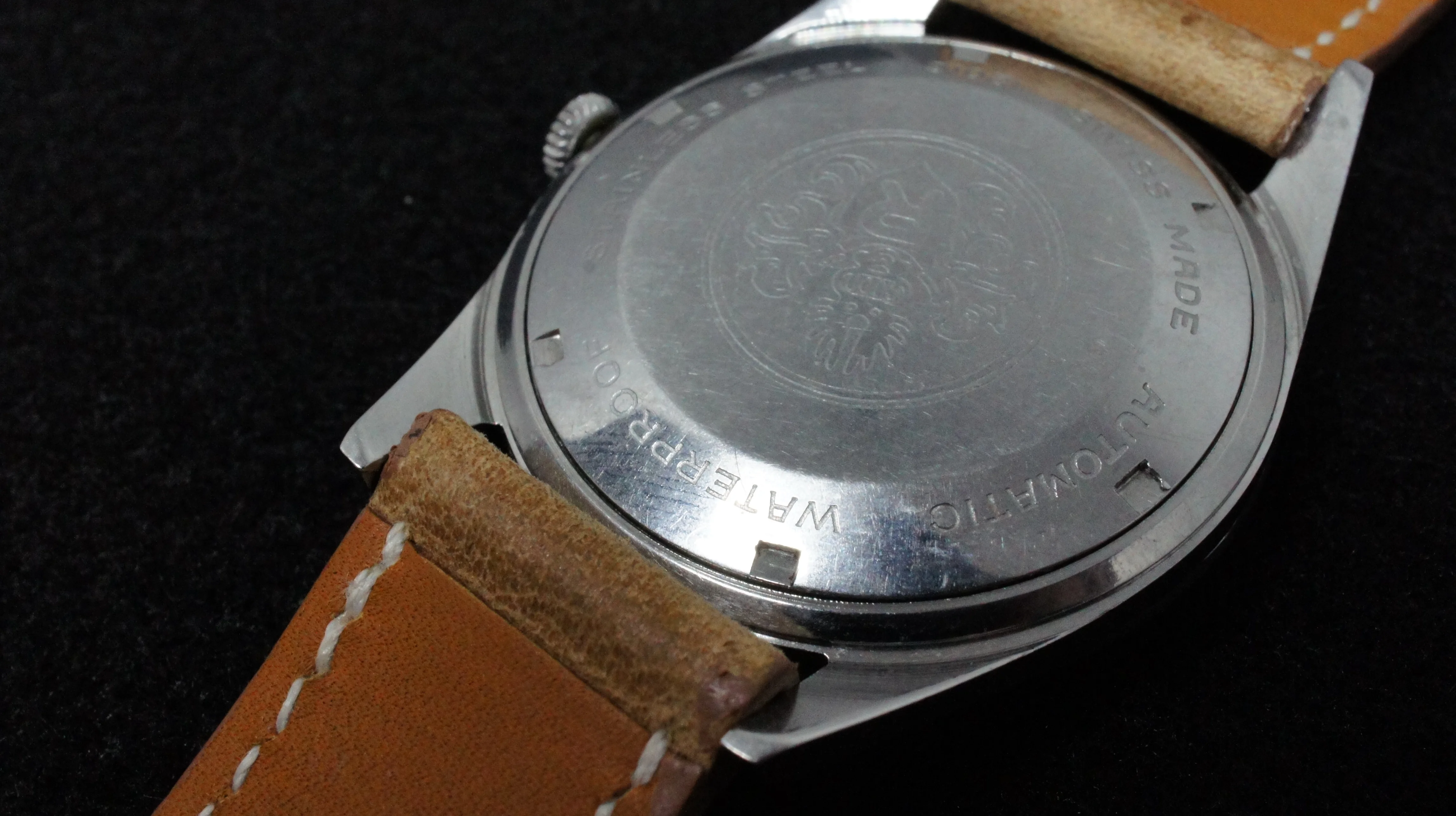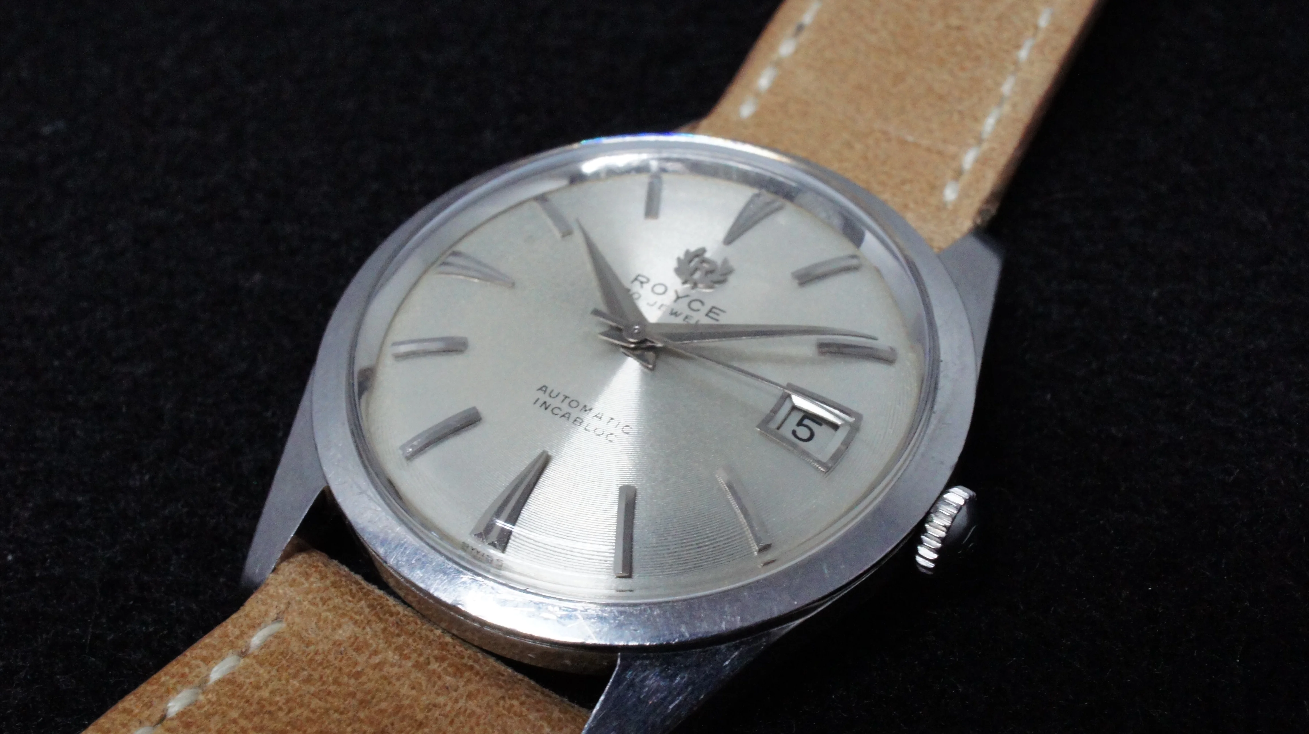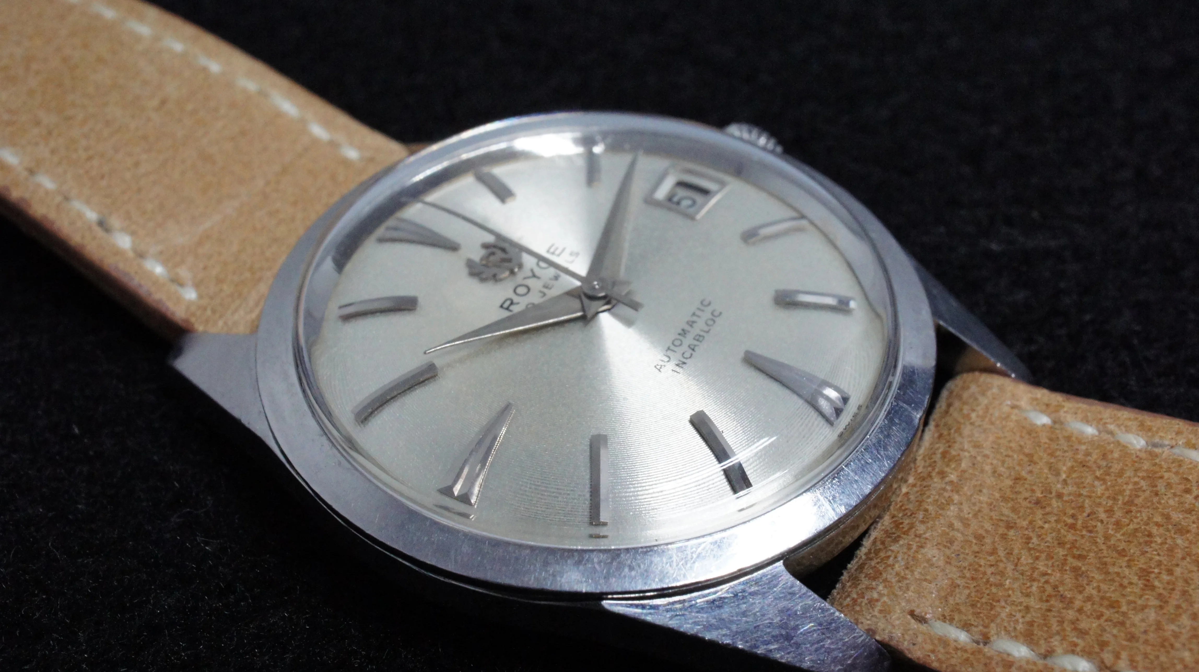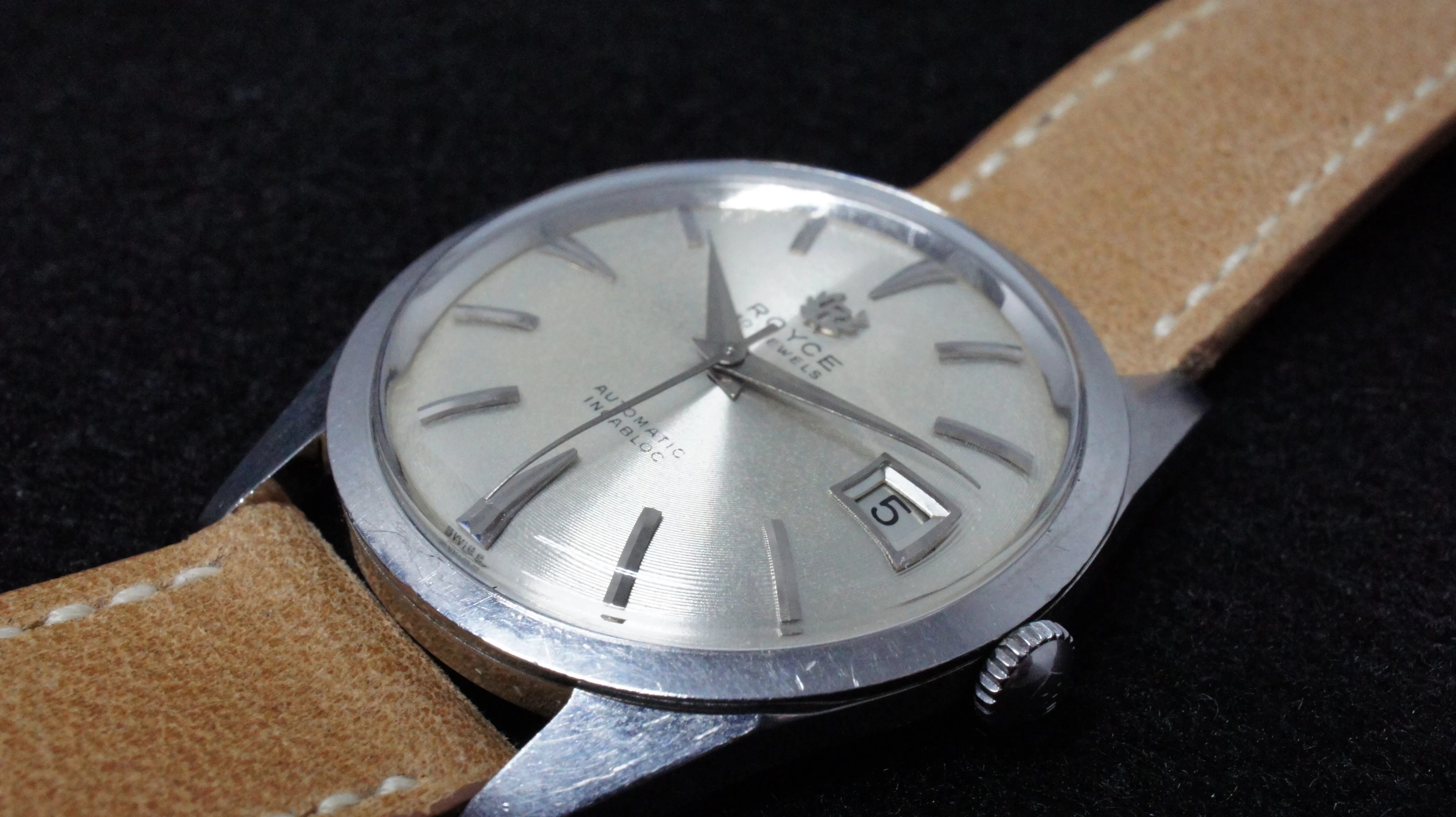 This is a vintage 1962 Royce, featuring a 30 jewel automatic movement and beefy all steel case, 36mm excluding crown. I had the watch serviced by a professional Swiss-trained watchmaker (details to buyer upon request) about a year ago and is in excellent working order. Dial has beautiful fine concentric rings, similar to a vinyl record. It comes on a new Hodinkee leather strap, regular length, in the correct 19mm width. Below is a 1962 Royce ad, featuring this model. Watch has a nice wrist presence. A classy piece. US$450, includes paypal/shipping USA/ Canada.