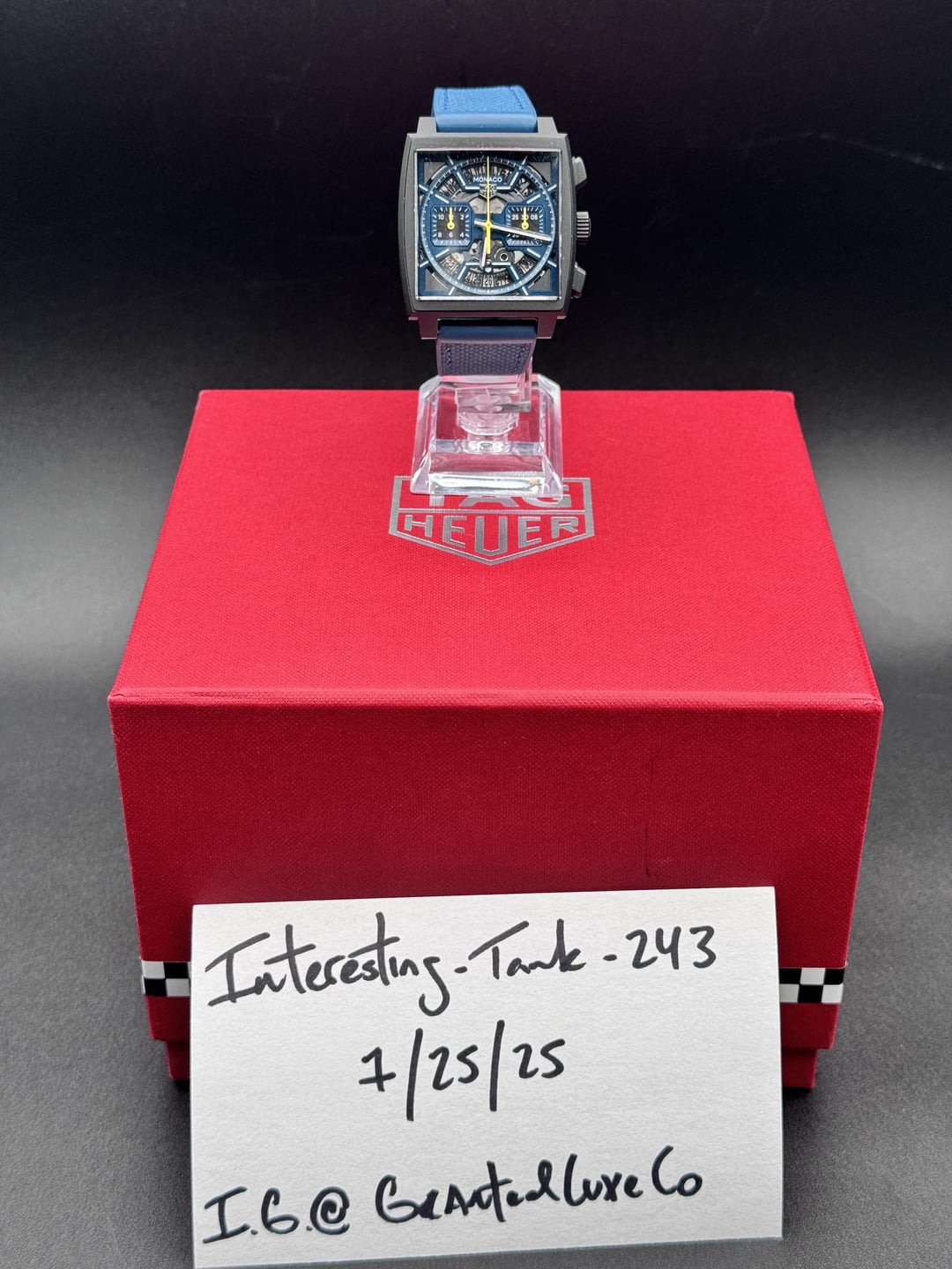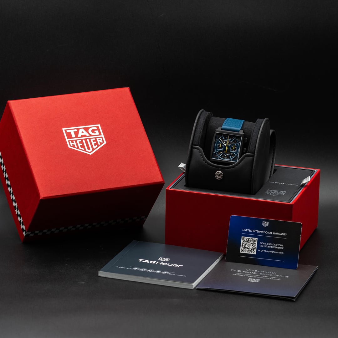 TAG Heuer Monaco Skeleton Chronograph 39mm Titanium DLC case CBL2188.FT6261 One of the most iconic chronographs ever created, the Monaco! This one in the new black DLC titanium case with the skeleton dial! The unique square dial of the Monaco was the housing for one of the first automatic chronographs ever. Today, it is still the flagship of the TAG Heuer brand. This watch started its life on the wrists of the famed drivers of Formula 1 in the late 60’s and early 70’s. This variant is a modern reinterpretation of the iconic design, bound to turn heads! Complete set that includes 5 year manufacturer warranty Product Specification -Reference : CBL2188.FT6261 -Case Diameter : 39mm -Case Material : DLC Titanium Sand-Blasted -Dial : Black Dial -Glass : Sapphire Crystal Glass & Transparent case Back -Strap Material : Blue Rubber & Leather Strap with Folding Clasp Push-Buttons -Movement : Automatic Calibre TH20-00 with 80h Power Reserve -Water Resistance : 10 ATM Price $8800 + shipping Payment bank wire, cash or Zelle Location Charlotte NC