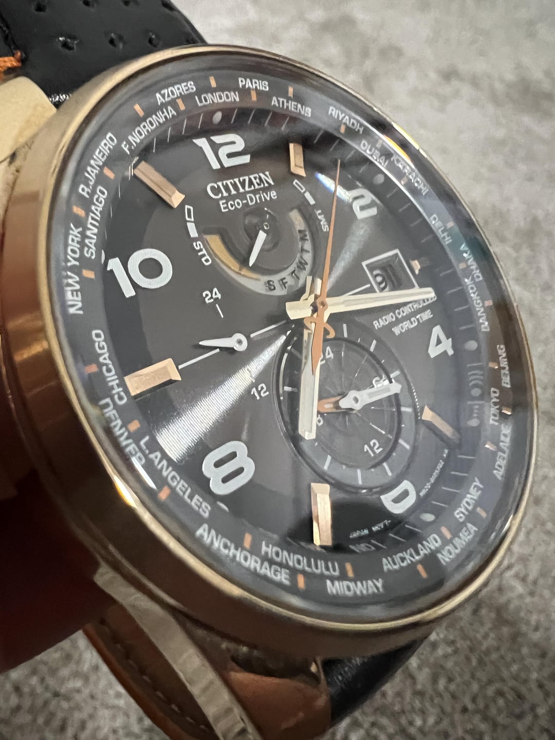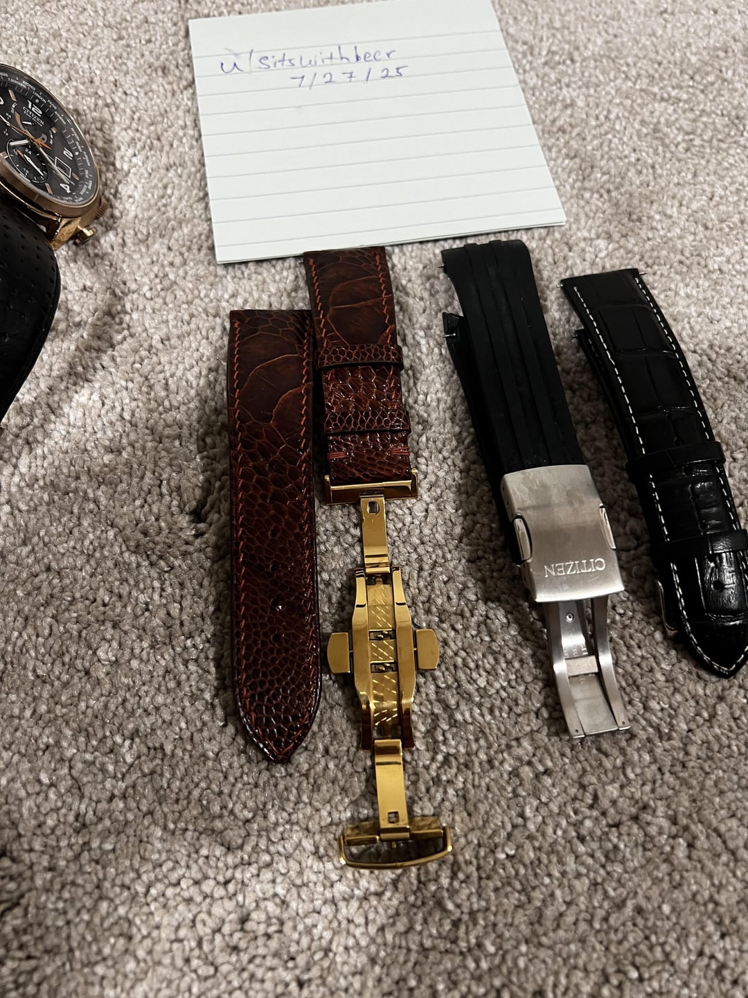 Hi folks, got this as a gift a while back and although I love almost everything about this watch it simply doesn’t get enough wrist time due to its size (45mm). Hoping to find a better home for it for someone who will appreciate it more. As far as I can tell it runs great. It’s been mostly living in my desk so I did have to charge it with light but it picked right up afterwards. Lume is great. Tons of features, including atomic sync, saphire crystal, solar charging, chrono functions and a bunch of timezones. Model is H820-S087546. Has ine of the best eco drive movements, super accurate and reliable. Cheapest on ebay rn is $250, so offering this at $200 shipped! Also comes with an additional Citizen black leather strap as well as a custom strap I had made for it from an ebay/etsy vendor (ostrich maybe? I forget). Happy to facetime and answer any questions you have. Paypall G&S works for me but open to other payment methods as well. Thanks for looking!