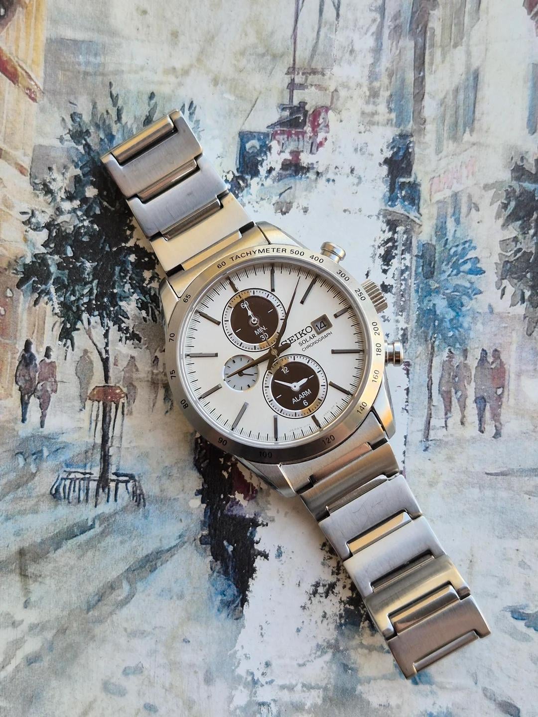 **For sale I have this nice Seiko Solar Panda.** Watch is in used but good conditon. Glass is without any marks, I think it is mineral glass , case is with normal signs of use. Size of case is 42 (w/o pushers&crown), there is some discoloration on dial as u can see on pictures. Watch runs with **seiko solar V172** movement and works very nice. Chronograph works as need to, it reset normal to 0. Bracelet apx 18cm wrist size. Pictures: [https://imgur.com/a/rQeyVyR](https://imgur.com/a/rQeyVyR) timestamp: [https://i.imgur.com/y1v4uK4.jpeg](https://i.imgur.com/y1v4uK4.jpeg) Price: 220**$** Paypal (FF or G&S +5%) / Revolut / Wise, shipment included in price, worldwide (from EU ) The watches I sell are from my personal collection, I am a fan of watches, I often renew my collection by buying and exchanging watches with other collectors around the world.