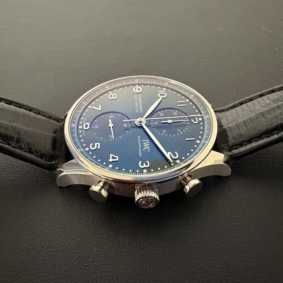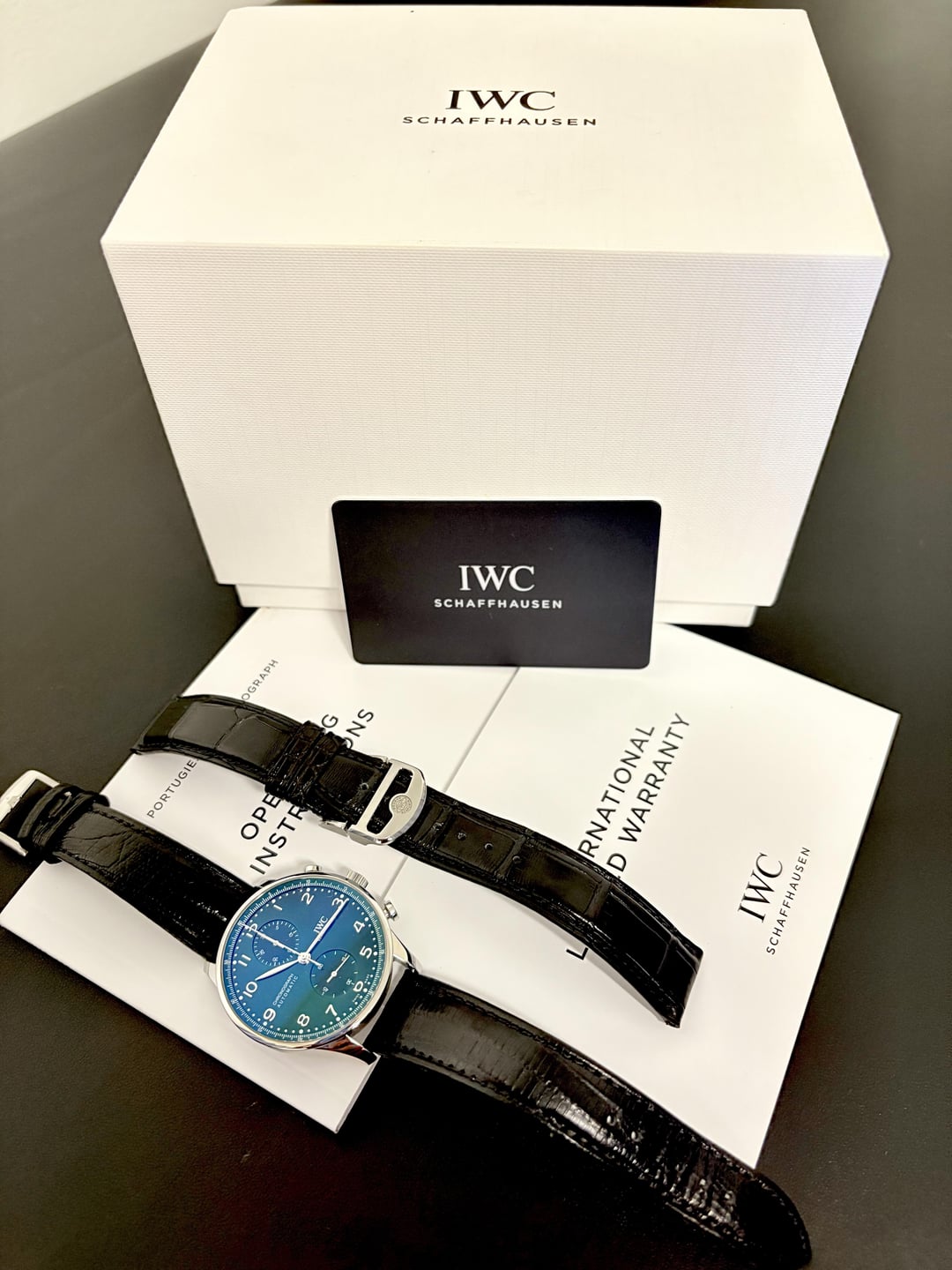 **For Sale: IWC Portugieser Chronograph IW371615** **Watch Purchased:** February 23, 2022 **Description:** The IWC Portugieser Chronograph reference IW 371615 has a stainless steel case of 41mm. The watch features a green dial with two chrono sub-dials, the small seconds at six and a 30-minute counter at 12. Two push buttons operate the chronograph function on the side of the case. Clean symmetric aesthetic with No Date, polished hands, AR coating. Powered by the automatic 69355 caliber movement, this watch offers a power reserve of 46 hours. The sapphire crystal glass with an anti-reflective coating protects the watch from scratches and provides a clear view of the dial. The case is slim for a chronograph at 13mm tall. Water resistance to 3.0 bar, or 30 meters. IWC info: [https://www.iwc.com/us/en/watch-collections/portugieser/iw371615-portugieser-chronograph.html](https://www.iwc.com/us/en/watch-collections/portugieser/iw371615-portugieser-chronograph.html) The watch runs as expected with no mechanical issues nor defects. Case and crystal are in excellent condition. **What's Included?** Included is the International Watch Company Portugueser black alligator leather strap with deployant IWC buckle, as well as an aftermarket black lizard band & tang buckle. This watch comes with its original outer box, instruction booklet, cleansing cloth, warranty card, and warranty information. **Price: $5400 OBO** plus preferred shipping w/ Signature Confirmation. **Trade:** Not accepting trades for this watch. **Location:** Los Angeles, CA for local pick up. Facetime available upon request. Sold as is. No returns.