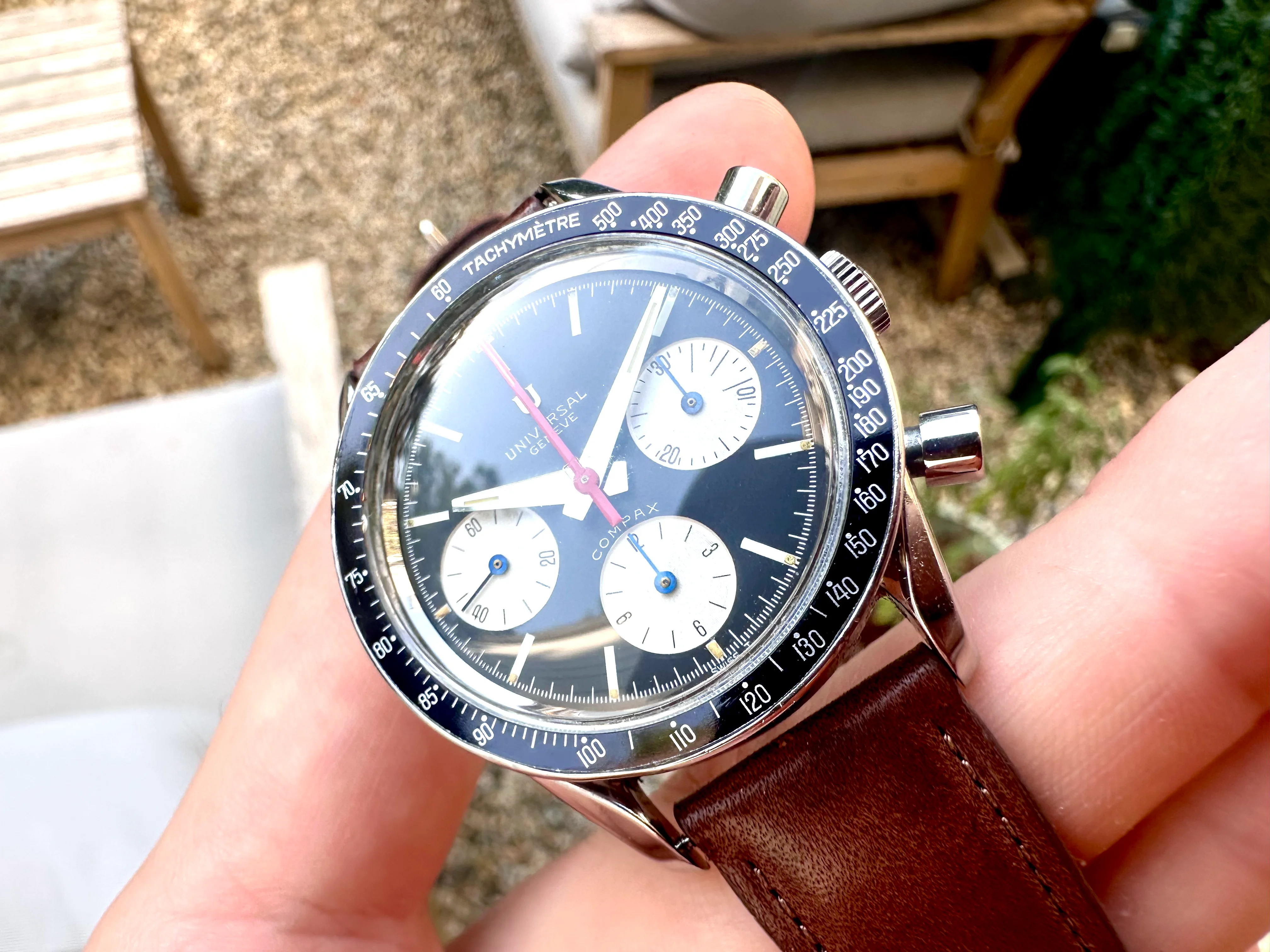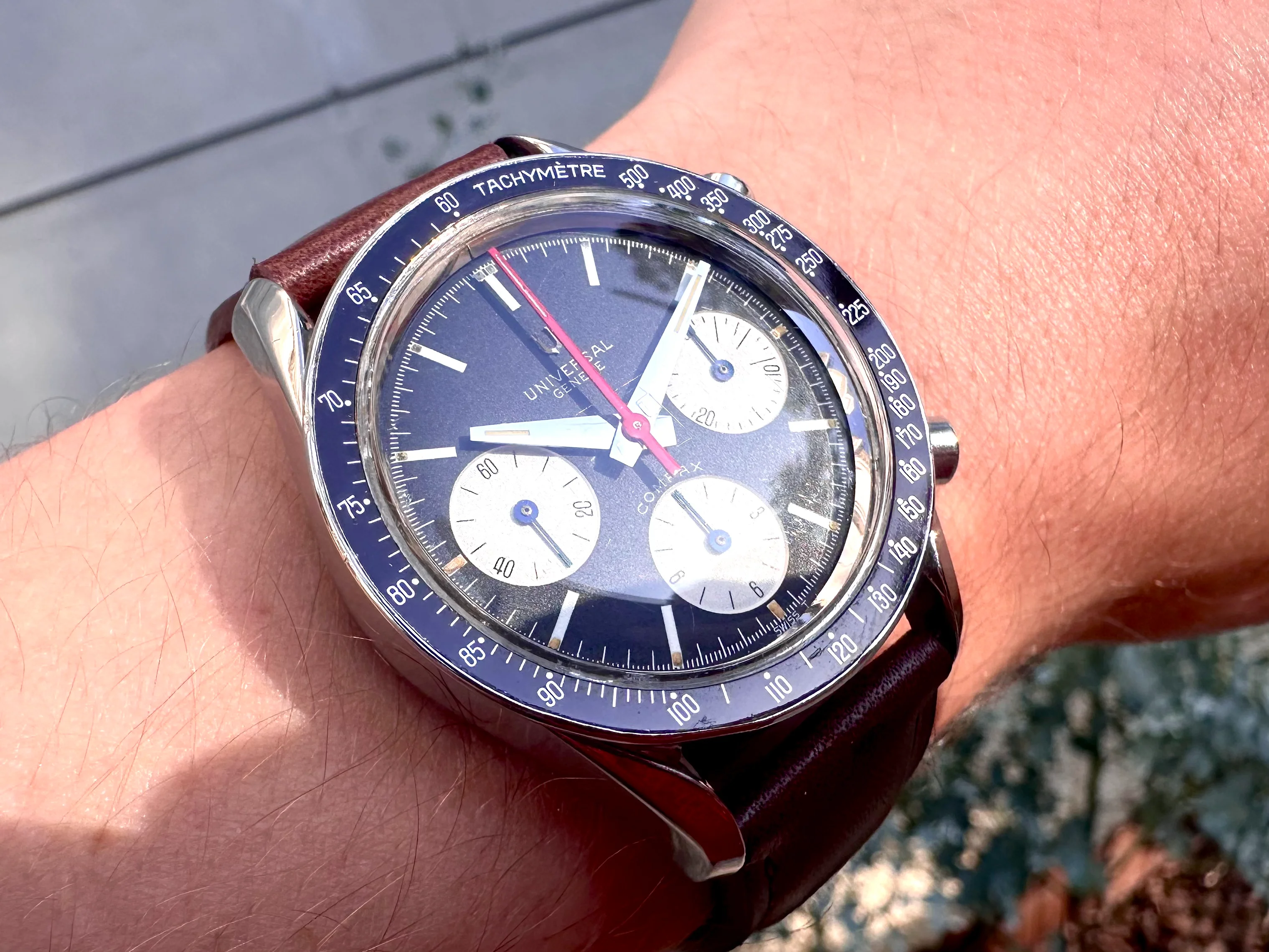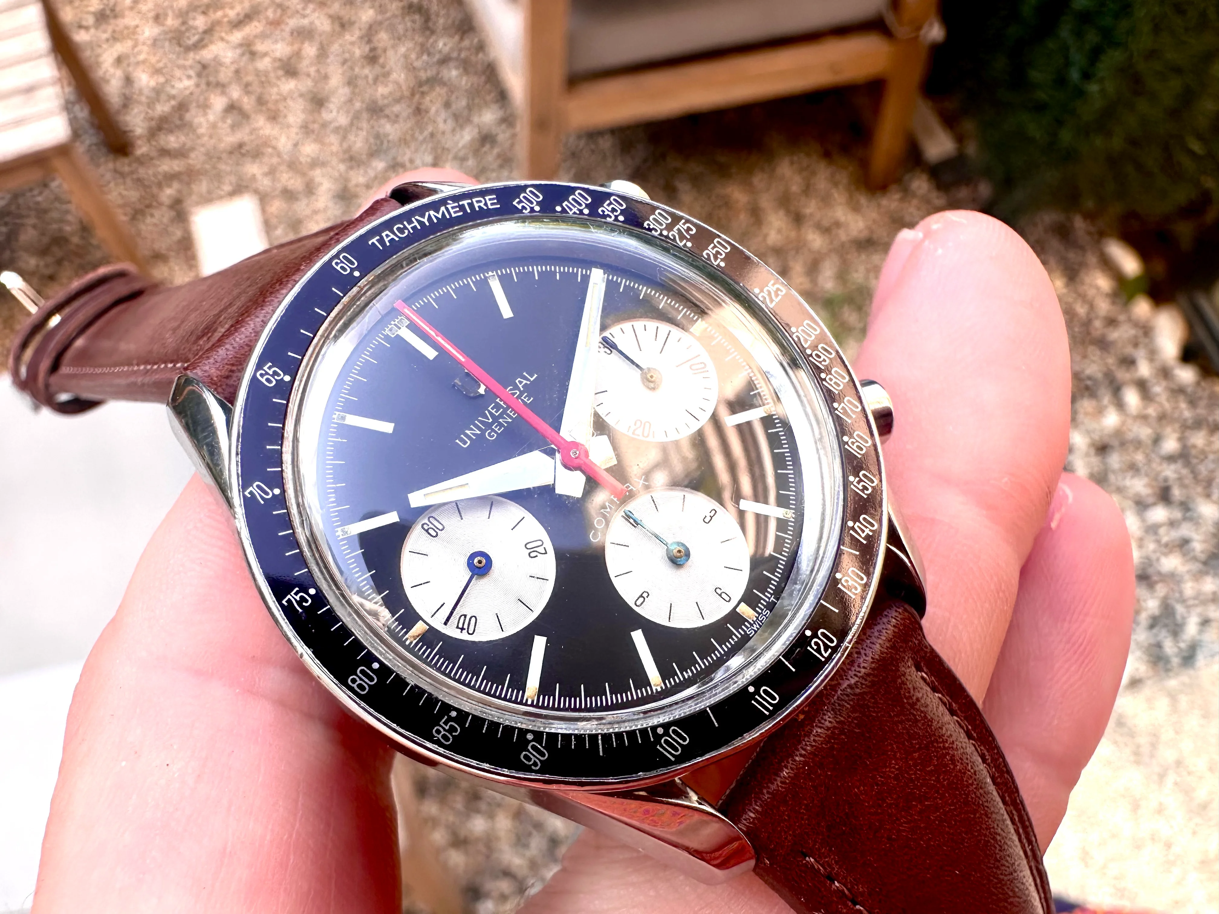 The watch is in absolutely original condition: original pushers, crown, dial, all hands, and plexiglass – signed Universal Genève. The crown bears the correct logo, and the plexi is signed at the center. The case, polished in the past, remains in excellent shape although serial number is not visible. The dial shows no marks, only a few dust particles; the plexi is free from scratches.
