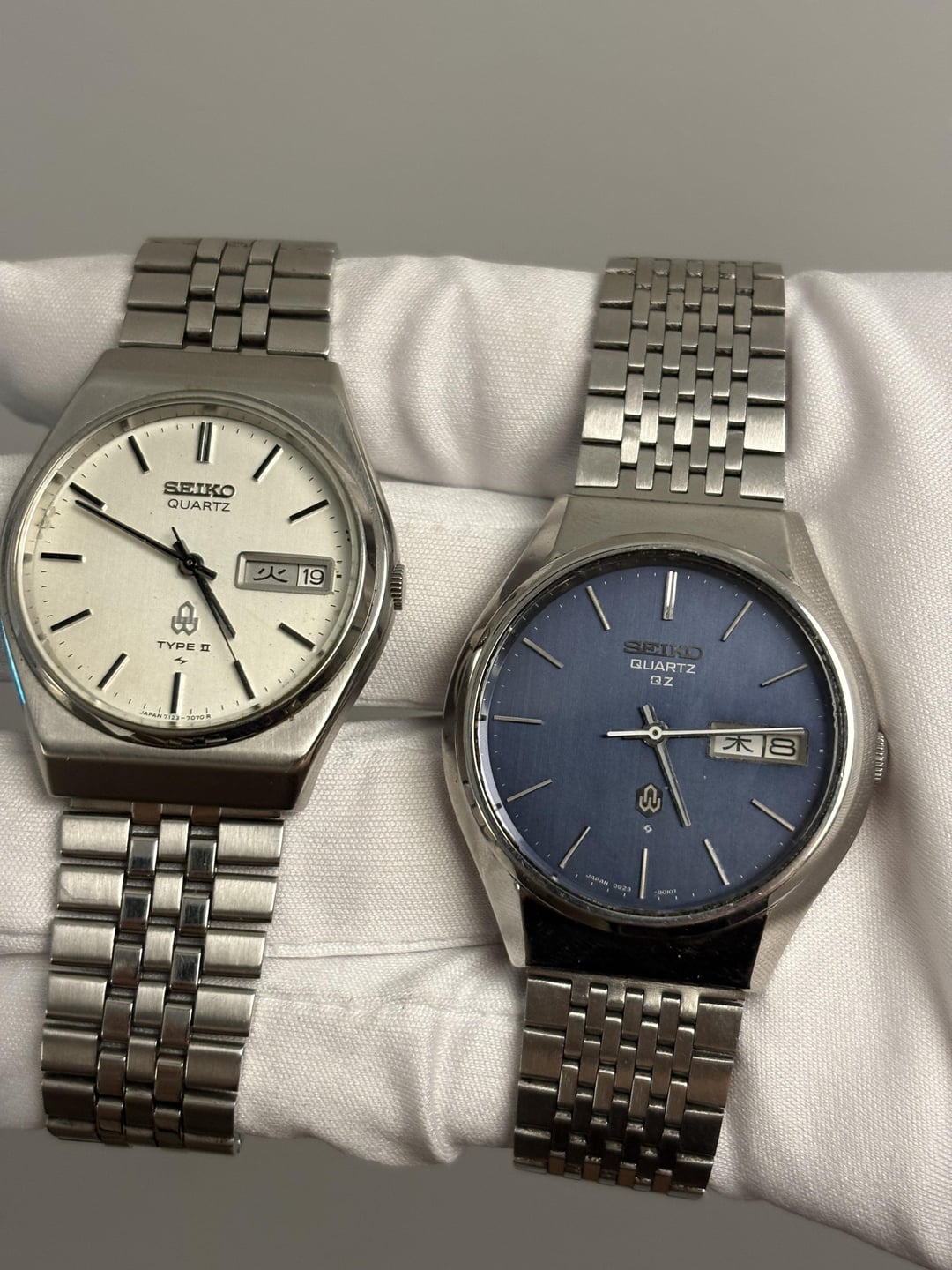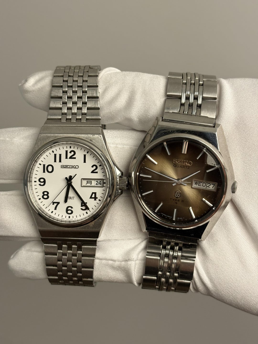 Monday sale! Need to move pieces quick! Looking to sell this collection of vintage Seikos! Based in Durham, NC, USA Prices are in order of pictures from LEFT to RIGHT: Silver Lord Matic 5605-7020 - $300 *White Type 2 0903-6000 - $175 Gold King Quartz 9443-7000 - $199 Silver King Quartz 4822-8010 - $199 Silver Type 2 7123-7070 - $150 *Blue QZ 0923-8010 - $175 *Silver Silverwave 7546-7090 - $150 Blue Type 2 7546-8080 - $175 Spirit 7N43 7B70 - $150 *Brown Faceted Dial 0903-8140 - $175 *Silver King Quartz 9923-8050 - $199 *Dark Blue Type 2 7546-8000 - $150 White Chronos 8123-7090 - $150 Black Silverwave 8229-6030 - $150 Type 2 Day/Date 3803-7020 - $150 Silverwave White Dial 7546-8010 - $150 All have original bracelets unless marked* Worldwide shipping via insured USPS or UPS I accept Zelle, PayPal FF, PayPal G&S (+5%), and Venmo I’m open to offers and bundle pricing! PM for more images and info! Thanks for looking and comment before PMing!