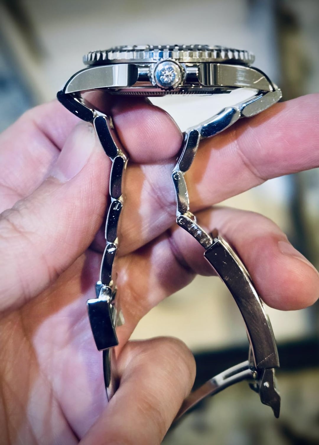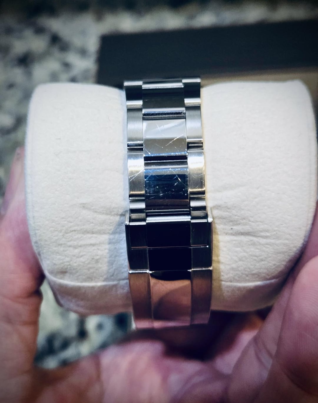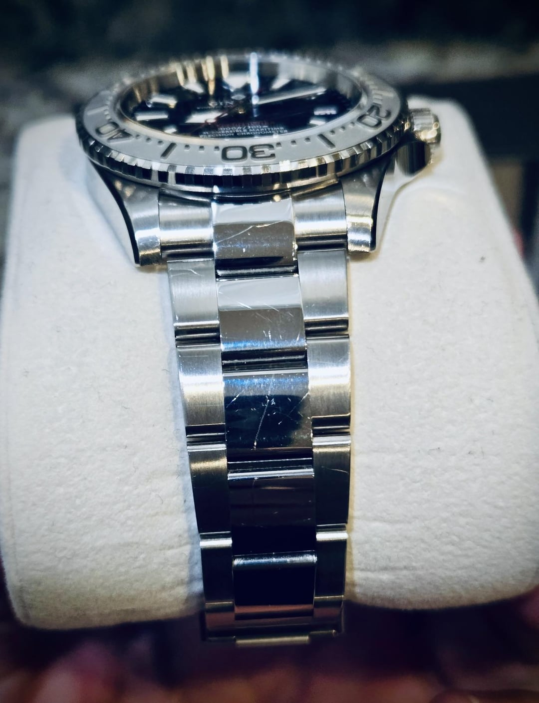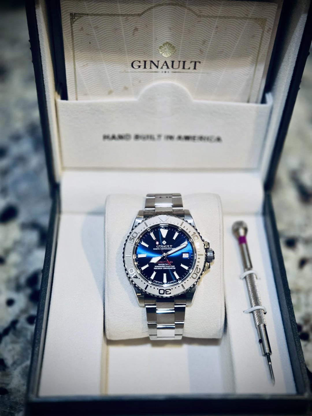 Timestamp: https://imgur.com/gallery/exp-timestamp-dY4Lo8I Pics: https://imgur.com/gallery/exp-pics-o1AYSTc FSO: $1k OBRO, shipped USA. No trades please, trying to recoup some funds on another purchase. Up for sale is my personal Ginault Expeditioner in ocean blue 🔵 the enameled sunburst finish is amazing, it can be dark navy to almost black on low light so it’s super versatile. The ceramic relief bezel is very “Yachty” in its look but the pops of red on the date wheel, dial, second hand are so well executed. The optometry grade crystal is one of the most legible with the least amount of glare you can find for anywhere near this price. The mil-sub sword hands and stick indices hold a ton of line and shine through the whole night. Currently sized for a 7.25” wrist with 2 full and 1 half removed links included. The movement has been keeping around +1 to +2sec/day for me, the regulation chart and full kit all included. The 120-click bezel is one of the smooooothest, while still being super audible. It’ll make you smile, guaranteed. Movement: Sellita 200-1 regulated in-house in 6 positions over 6 weeks Power reserve: 40hrs (per in-house testing) Case: 40mm Lug to lug: 47mm Lug width: 20mm Thickness: 11.5mm Water resistance: 300m / 100ft I added some filtering to highlight the hairline and micro blemishes on clasp and polished inner links on the bracelet, but to the naked eye or on wrist it’s still in great shape with some markings simply because polished bracelets are what they are. In-person and on wrist, it much less noticeable than these photos highlight. Crystal and bezel are completely clean and blemish-free. Clasp has a little normal desk diving but not much. Shipped from Abq, NM - US only Venmo, Zelle, PP FF only Please feel free to reach out to me if you have any questions or would like extra photos/video, more than happy to send over!