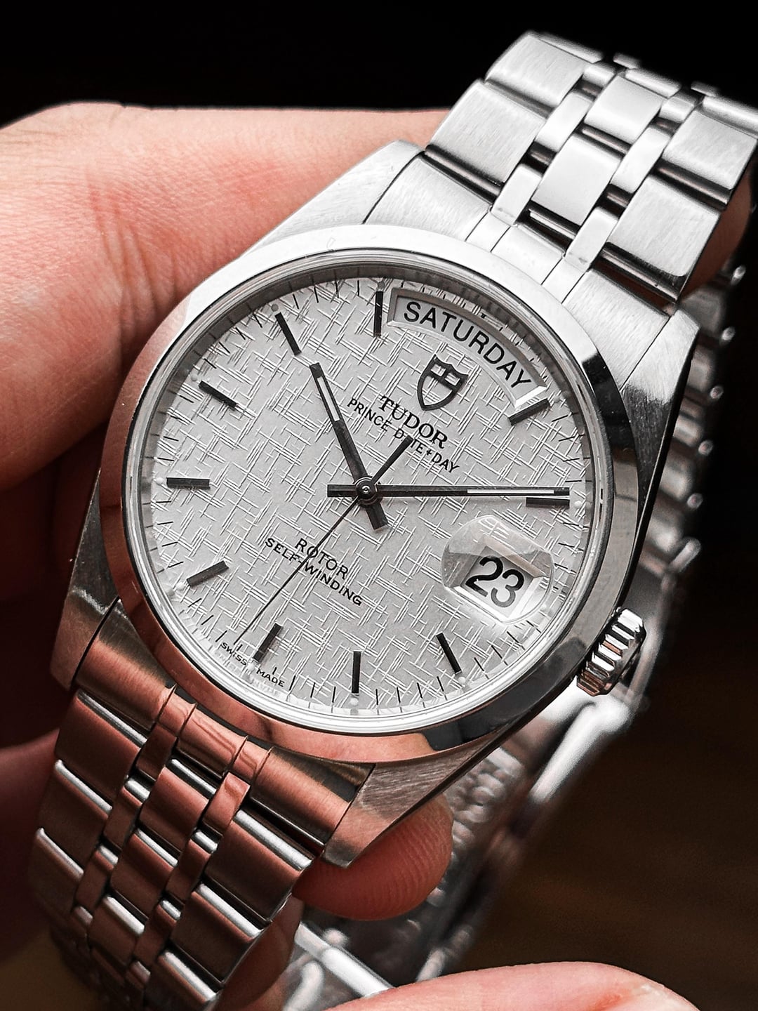 Up for sale is the Tudor Prince Date-Day 76200 with a stunning linen dial in excellent condition. Images: https://drive.google.com/drive/folders/1M0_HcDrT_PZxmIx-4M7aOvhlSELRokT3 Video: https://drive.google.com/file/d/19vU0XMVgqq-cBXHo_napNGPIVan0M_Vf/view?usp=drivesdk Timestamp: https://drive.google.com/file/d/1LLJMa4yHp6aX-65RuMQXd6mpxwlOTnR_/view?usp=drivesdk This reference sits at the crossroads of the classic Tudor design language and the more accessible, everyday interpretation of the Rolex Day-Date. If you’re after something that doesn’t take itself too seriously but still delivers heritage and versatility, this one is worth a look. The real standout here is the linen dial, subtle texture that catches the light in the most surprising ways, shifting from grey to silver to champagne depending on angle and lighting. Specs wise, you get a 36mm case, 43mm lug-to-lug, 10.2mm thick (11.3mm including the cyclops), and 100m water resistance with a screw-down crown. Inside is the tried-and-true ETA 2834-2 automatic movement, keeping reliable time. This watch is in excellent condition, showing almost no scratches at all. Crystal is nice and clean. Watch comes fit on the OEM bracelet that fits up to 20cm (8 inches), bracelet is in great condition with no stretch. The watch has been serviced and it is currently running at an astounding +/-1s a day and amplitude of 270. Watch comes with Tudor box (no papers or card) Price: $2,050 + $35 flat shipping (via DHL express — fully insured). Payment via PayPal F&F or G&S (+4.6% fee paid by buyer). No trades please Feel free to message me with any questions or if you're interested. Have a great day! Check out my other watches on Instagram: @jasonswatchcorner