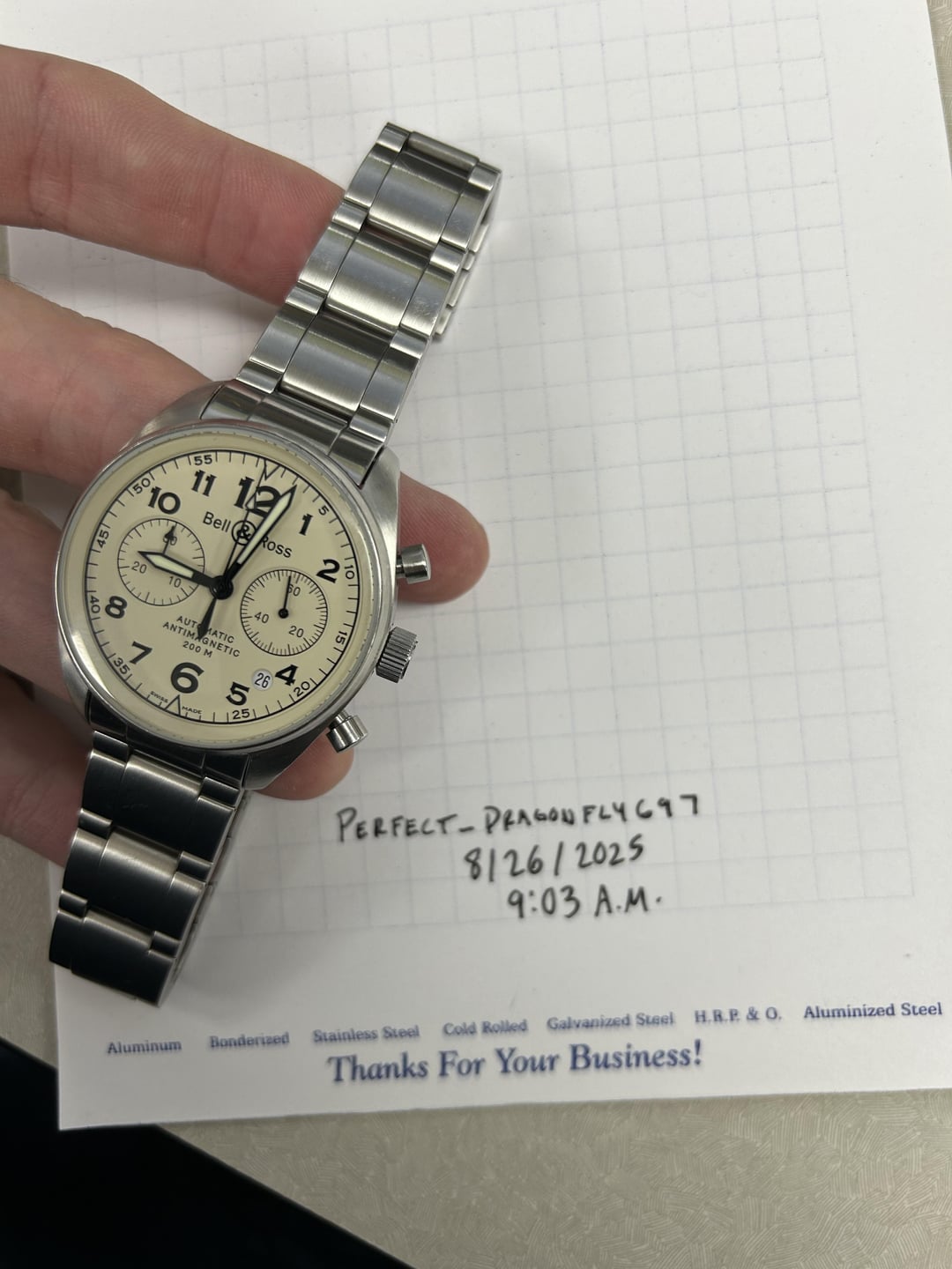 Up for sale is my B&R 126.A-S13029, 39mm, Cream Dial- ETA 289xx Chronograph, 37 jewels Anti-Reflective, scratch free sapphire crystal, beautiful open sapphire caseback, antimagnetic, 200m of water resistance Comes with: deployant clasp + leather band, factory 126 bracelet purchased from B&R in 2024 + extra link Priced at 2,500, open to offers as well as TDR trades. (79000n, 79030) Any other questions, please feel free to ask! Thank you,