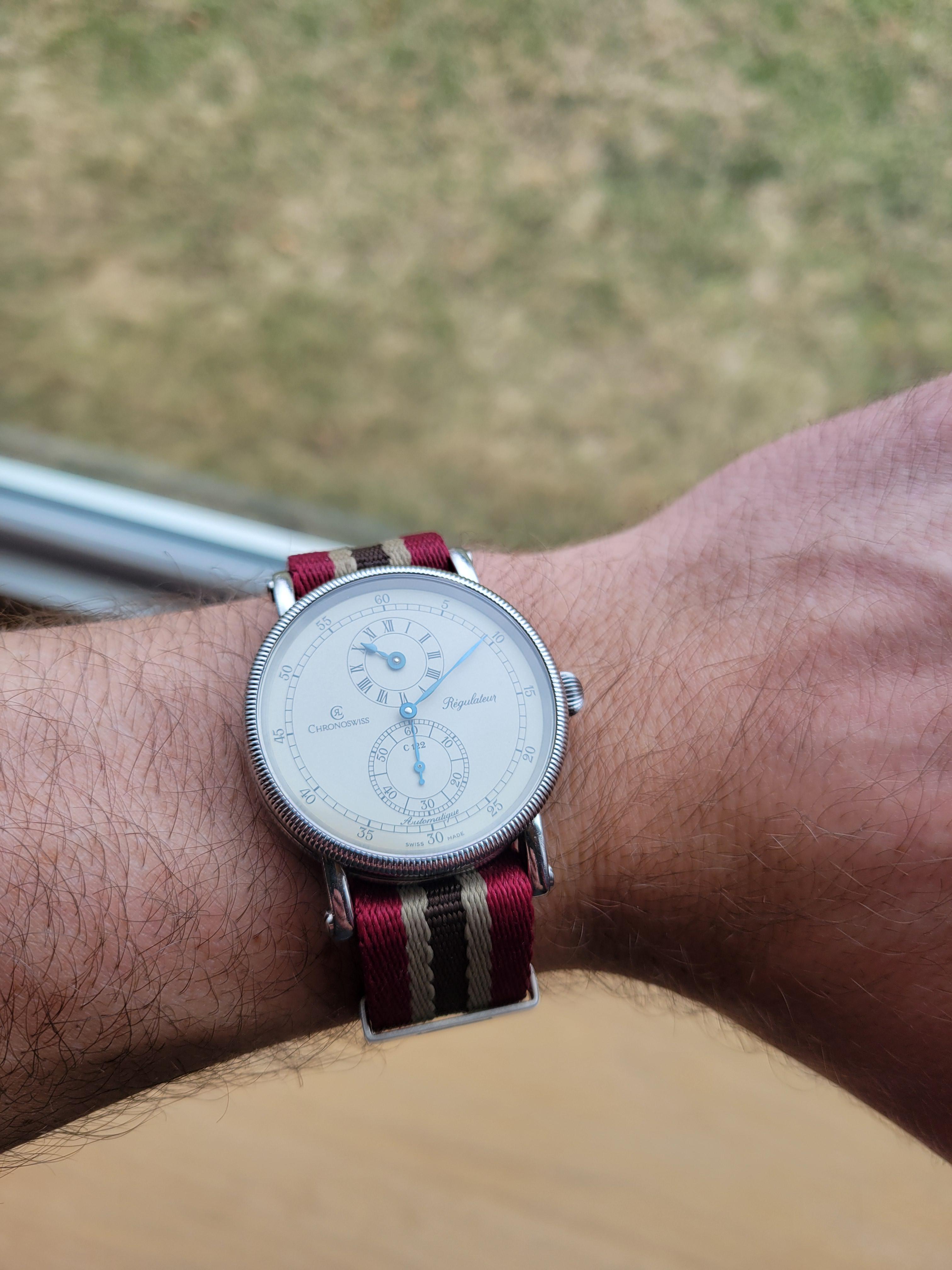 Up for sale is my Chronoswiss Regulateur ref CH1223 from the mid to late 1990s in overall good condition, with surfaced nicks/marks across the steel case in a very uniform way, indicative of a well used watch but not beaten up. Watch is 38mm in diameter without crown, 10mm thick and 20mm lugs. Sapphire crystal back and forth are scratch free. The dial is 100% clean in a creamy tone and also scratch free. Hands are heat/thermal blue and absolutely a joy to look at in different lighting. Caliber C.122 has 29 jewels, beats at 21600 vph, and is based on vintage Enicar cal. AR-165D, modified and beautifully finished by Chronoswiss with gold chatons (only found in high end pieces nowadays) around the jewels, Geneva stripes and perlage. These early Regulators by Chronoswiss are known to be the first serialized Regulator style watches commercially available back in the days. No box and papers, strap in photo is not included. My price is $1,300, insured via USPS/UPS in the US (lower 48 states). Zelle preferred. [Video of watch showing condition](https://imgur.com/a/SO0xtBO). Timestamp: https://imgur.com/a/c7QPALn
