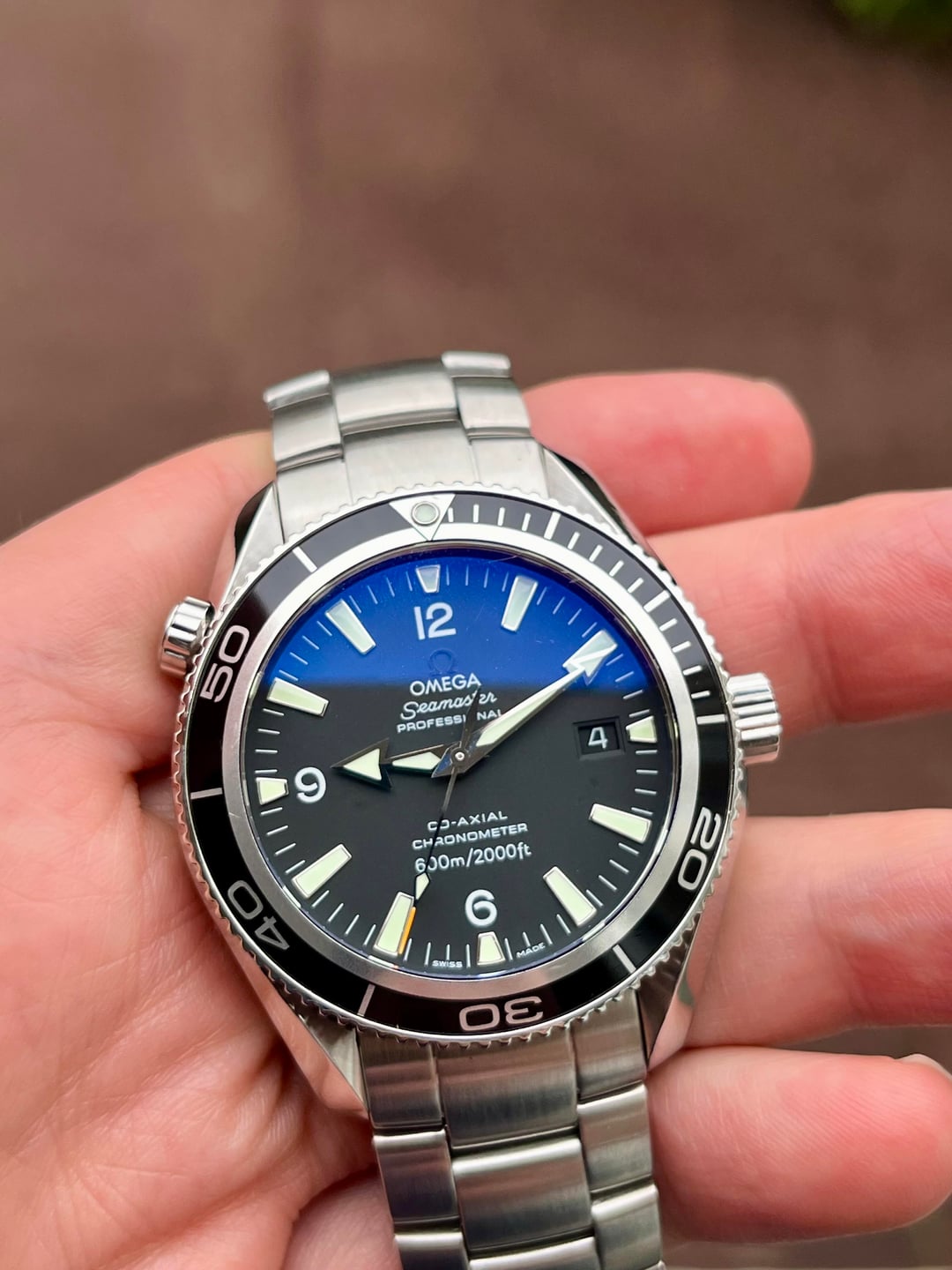 Up for sale today is this very cool **Omega Planet Ocean** ref. 2201.50, with it's original box and papers. It's a beautiful example of a 1st generation 42mm model. The watch comes in very good to excellent condition, with a clean bracelet and case. There are some blemishes on the dial that can be seen in the photos. I've taken these into account when pricing. It comes with the original inner + outer box, instruction manual, warranty card (dated May 2005). The watch was serviced approx. 6 months ago and as such, is running nicely. **Price: $3,250.** I can provide references from 600+ prior successful watch transactions. If you have any questions or would like to see a video, please let me know. Thanks!
