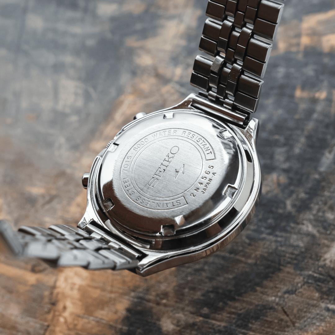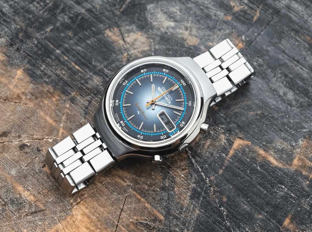 A rare Seiko Speed-Timer JDM variant watch in good condition. Stunning Blue sunburst dial with a orange popping second hand and luminous indices. Cool retro rally design. Unique cushion shaped robust case. Great build quality. Movement has been serviced. Great time keeping. Chronograph resets to 12. All chronograph functions are working fine. Amazing condition at 53 year old, ready to be used as a daily driver. Comes with the original Seiko signed bracelet. Crown perfectly blends into case. Such pieces should be appreciated upfront to experience at full measure, pictures don't do justice to this piece. Sunlight brings out most of its beauty. They were designed to have premium build quality but for only regions of Japan. Case is professionally polished keeping all the sharp brushed lines, edges and mirror finishing. Handling it, I can definitely guarantee this is superior to modern watches of the same price zone. It has both English and Japanese (Kanji) day options. The Kanji(Japanese) date highly complements the dial. The colors are very innovative on this piece, makes a statement of Japanese design. PRICE: $329 USD via Paypal, Wise, Crypto. FREE DHL 5 day Shipping worldwide. Considering a full service has been done to the watch, I'm asking a reasonable price. I have a good number of exchanges here for a safe transaction. Check my Instagram: [https://instagram.com/hour.lust](https://instagram.com/hour.lust) * Manufacturing Year: NOVEMBER 1972 * Caseback Reference: 7015-7000 * Case size: 39 mm (without crown) * Lug to Lug size: 44 mm * Case Thickness: 12.5 mm * 7015 Automatic flyback chronograph Movement Pics: [https://imgur.com/a/87ZNx5B](https://imgur.com/a/87ZNx5B) TS: [https://imgur.com/a/DMn1wMh](https://imgur.com/a/DMn1wMh)
