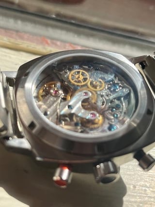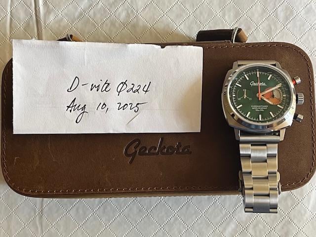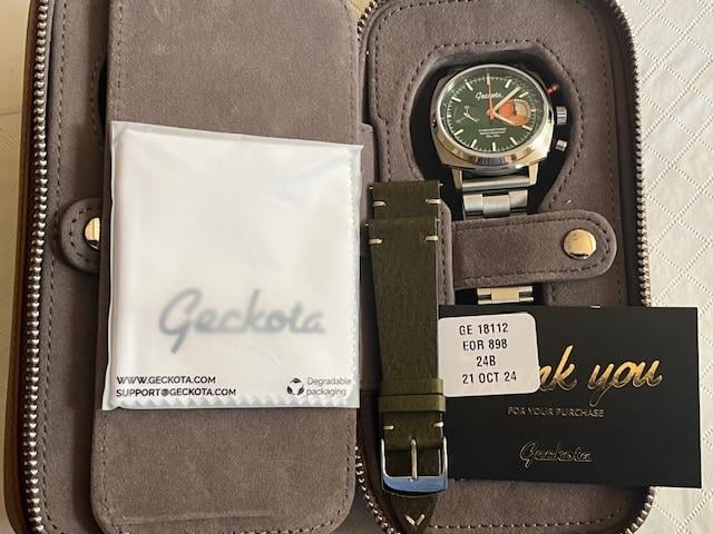 Repost and price reduction! Now only $375! Selling my green sports chronotimer as I continue downsizing my collection. Geckota is a British microbrand that started out as a strap maker (WatchGecko). This uses the manual handwound 22-jewel TY2901 chronograph movement. More information on this model can be found here: [https://www.geckota.com/products/chronotimer-sports-edition-jade-green](https://www.geckota.com/products/chronotimer-sports-edition-jade-green) I have not seen these for sale in the used market, and so I have nothing to compare it with. These sell for $685 brand new, so I will ask for $375. The watch is in pristine condition. The case has no scratches and the crystal is clean. The caseback is see-through with a view of the lovely movement. I have worn it on the after-market steel bracelet (included), so the green leather strap is unworn and still has the tag. The price includes insured shipping to CONUS. I accept PayPal F&F, Venmo, and Zelle. Please add 4.5% to the price if using PayPal G&S. Please reach out to me if you have any questions or need more information.