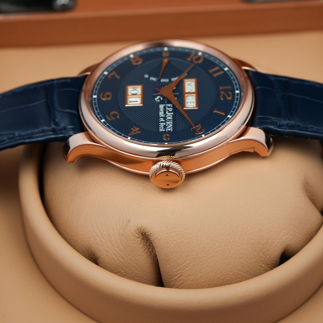2022 F.P. Journe Quantième Perpétuel Boutique Edition Timestamp: [https://imgur.com/nLD2Uuo](https://imgur.com/nLD2Uuo) A masterclass in mechanical elegance, the F.P. Journe Quantième Perpétuel redefines the perpetual calendar with a distinctive blend of technical innovation and timeless design. Housed in a 40mm 18K rose gold case—this extraordinary timepiece seamlessly integrates complex calendar functions with the aesthetic purity that defines the Journe signature. The blue guilloché Silver dial with 18K 5N Gold numerals and apertures is stunning to the eye. The dial layout is both intuitive and sophisticated. You’ll find the day and month just under twelve, the date above six, the power reserve to the right of nine, and the leap year indicator discretely tucked underneath the hour and minute hands at the center of the dial. Engineered for effortless legibility and user interaction, the Quantième Perpétuel has a discreet pull tab hidden behind the lug just above one o’clock. One simply pulls out the tab with their fingernail and pulls the trigger to change the months, and then everything else is simply set with the crown. Powering this horological marvel is the in-house Caliber 1300.3—crafted in solid 18K rose gold—offering a 120-hour power reserve and unparalleled chronometric performance. True to François-Paul Journe’s vision, the Quantième Perpétuel is not just a calendar watch—it is a statement of uncompromising craftsmanship and horological art. Comes as a complete set with Inner/Outer box, Warranty Card, Polishing cloth. This beautiful timepiece is in excellent condition. Please look over my pictures closely as I like to properly represent the watch you will be receiving. **Offered at $174,999 Shipped in US or OBO.** Payments accepted: Bank Wire or Direct Bank Transfer (Bank of America). Shipping is always FedEx/UPS overnight, fully insured. I am an avid enthusiast and collector and am not affiliated with any watch brand I post. **Always open to trades or purchases! Looking for Audemars Piguet, Rolex, Patek Philippe, FP Journe, Vacheron Constantin, and other luxury brands.** I guarantee every watch I sell to be 100% authentic. Follow me on IG: JJ\_Timepiece\_Co Call or text (941) 800-3931