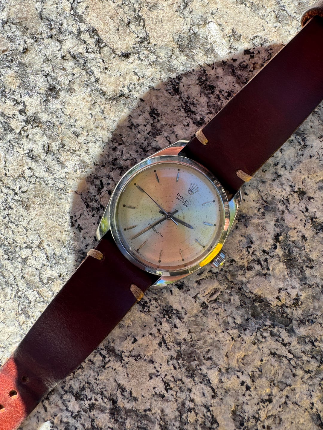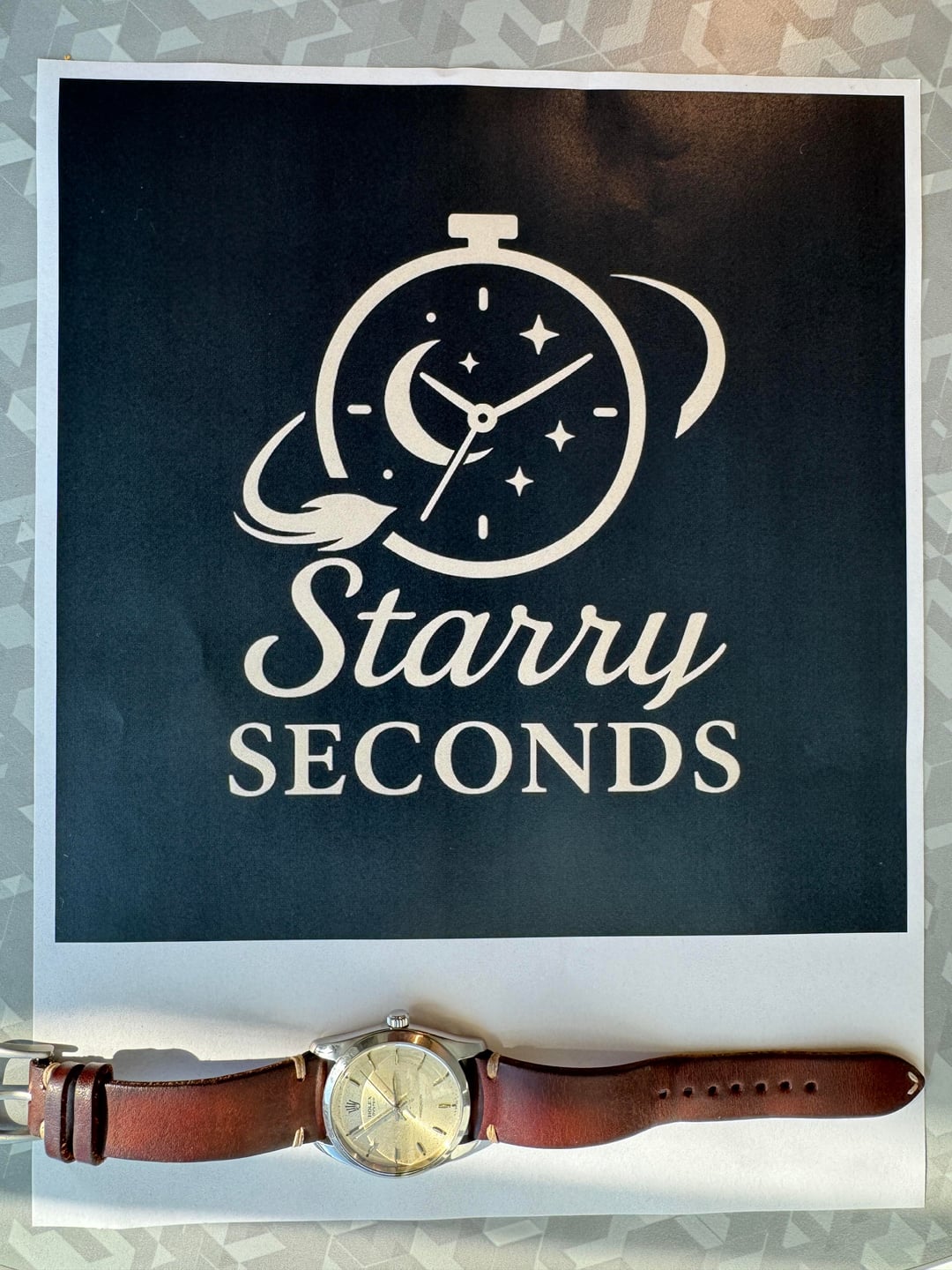 Welcome to Starry Seconds. Today we are offering up a Rolex Oyster Precision dating back to 1959. Up for grabs is our **Rolex Oyster Precision 6424**, often referred to as the “Big Oyster” thanks to its larger 36mm case size (unusual for its era). Produced in the 1960s, this watch embodies Rolex’s understated precision and timeless design. The clean dial, manual-wind movement, and robust Oyster case make it a versatile vintage piece — simple yet unmistakably Rolex. **Condition:** Very good vintage condition. Case is polished, dial is aged with natural patina, movement runs well for its age (under -30s a day) and keeps accurate time. **Specs:** * Reference: 6424 Oyster Precision (“Big Oyster”) * Case: 36mm stainless steel * Movement: Manual-wind Rolex caliber * Dial: Silver with applied indices * Bracelet: Aftermarket leather strap $1999 Paypal FF +5% for GS
