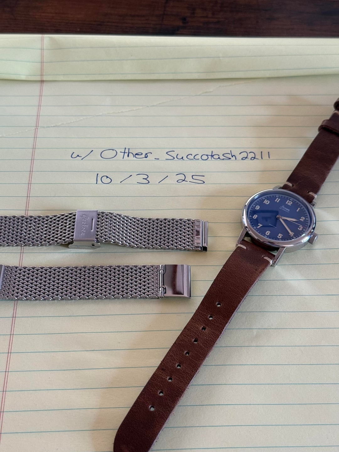 **For sale: Stowa Partitio Blau LE** Case: Polished Steel Dial: Matte Blue Movement: ETA 2824 Winding: Automatic Lens: Sapphire Strap: No OEM Water Res.: 5 ATM Diameter: 37mm Length: 46.9mm Thickness: 10.8mm Lug Width: 18mm **$599 Paypal F&F (G&S + fees), Zelle, or bank wire. Price includes shipping anywhere in the US.** Watch is in great condition, a few very minor scratches, no damage to crystal, runs within specs. Comes with excellent condition Horween leather strap and Geckota Milanese bracelet. [https://windupwatchshop.com/products/partitio-blau?variant=13942716956738](https://windupwatchshop.com/products/partitio-blau?variant=13942716956738) "Meaning “division” in Latin, the Partitio is an everyday watch with a straightforward design that is easy to read, modest in attitude and effortlessly stylish. Based extremely closely on a Stowa from 1938, the Partitio is sized just right at 37 x 46.9 x 10.8mm (including a domed sapphire crystal), giving it vintage charm with modern wearability. It’s a surprisingly solid case for the size as well, with a robust build, 50M water resistance, and reassuring heft. For the limited edition, we made the dial a faded denim blue that adds a slightly playful dimension to the design while maintaining its characteristic versatility. Paired with parchment lume, a red tipped seconds hand and a Sage suede Model 2 Premium strap, the Partitio Blau LE is a unique take on a vintage-inspired watch with an unexpected rustic charm. Inside of the Partito Blau LE is the ETA 2824-2 movement, a Swiss-made automatic workhorse movement. This caliber features 25-jewels, 38-hour power reserve, and hacking seconds (the second-hand stops when the crown is pulled out). The 2824 is a tried and true movement, thus making it a reliable favorite."