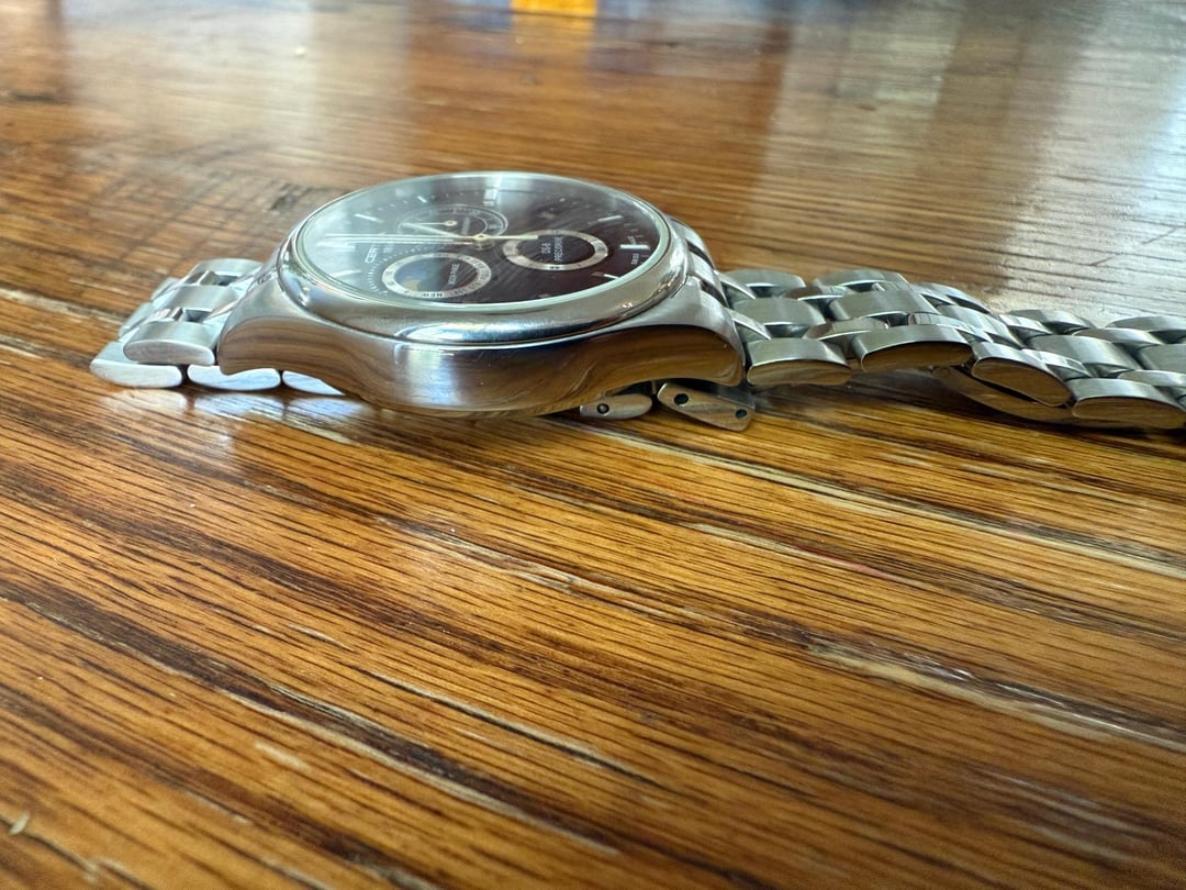 Hi everyone, I'm selling this Certina DS-8 Chonograph Moonphase, reference C033.450.11.041.00. The watch is in like-new condition—no blemishes on the case, crystal, or bracelet. A catch-and-release for me; I just set the moonphase function, but haven't worn it. Super solid piece—HAQ movement (accurate to +/- 10 seconds per year), really solid build quality, nice clean dial with lots of utility. Just a bit too big for me, alas. Asking $325, including shipping to CONUS. Just the watch and the generic box, as pictured (no papers, etc.). Basic specs: * Case diameter: 42 mm * Lug-to-lug: 51 mm * Lug width: 20 mm * Thickness: 12 mm * Movement: precidrive high accuracy quartz * 100 m water resistance