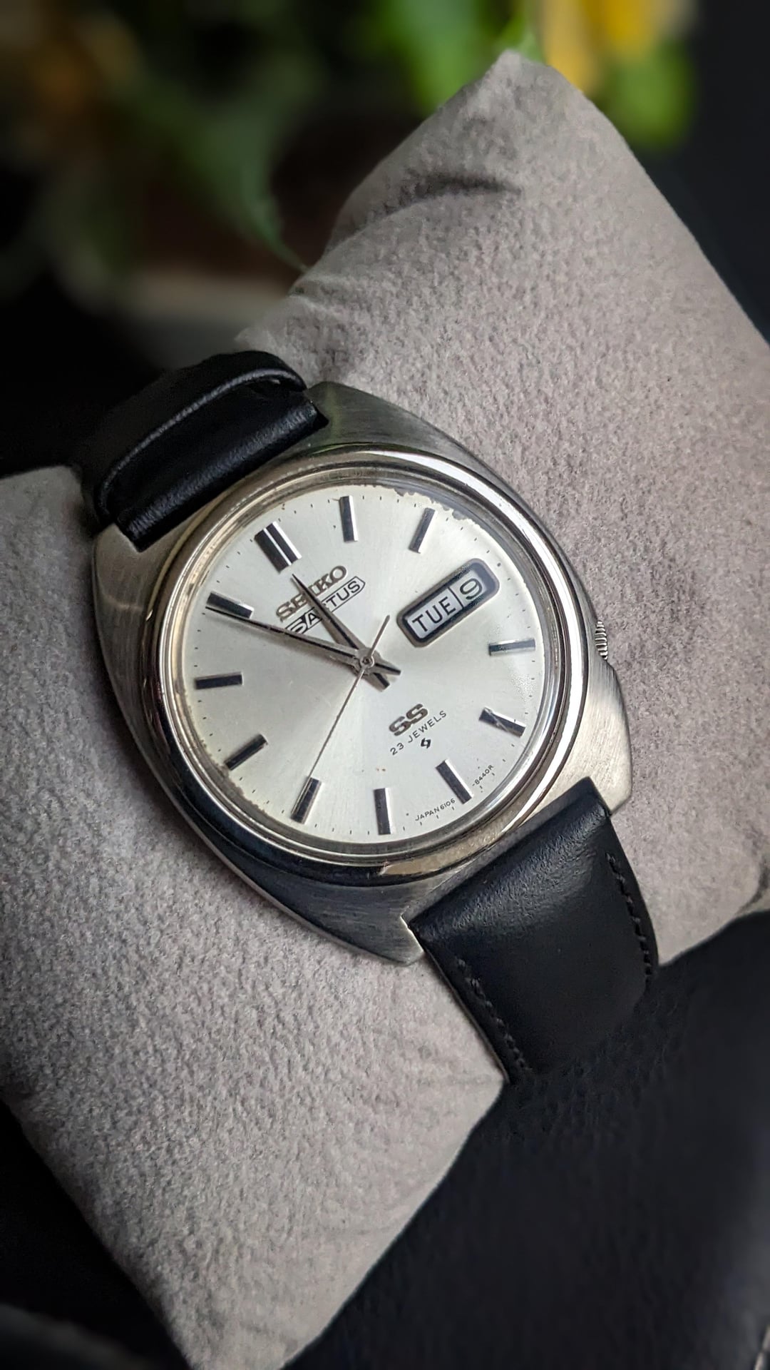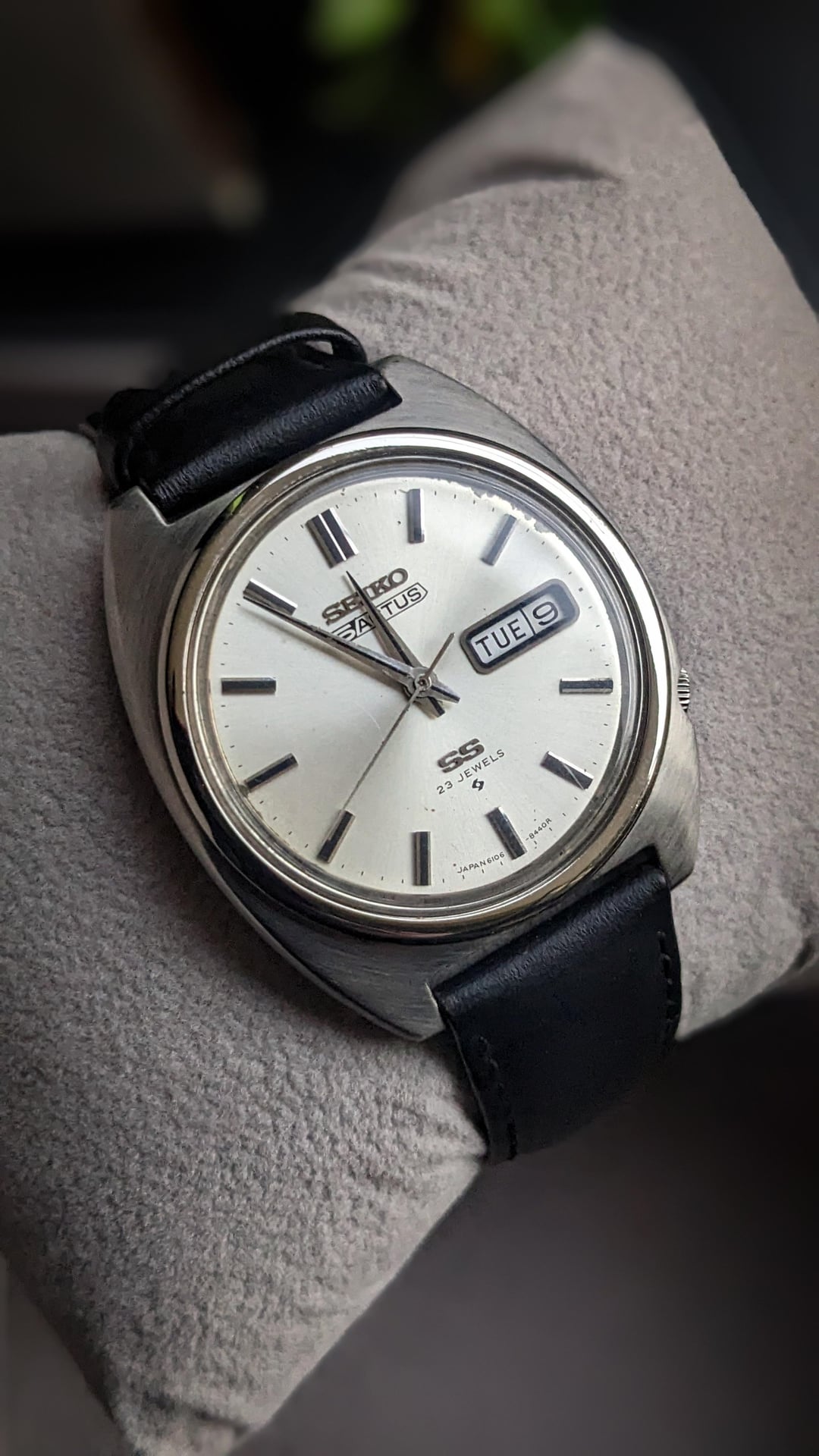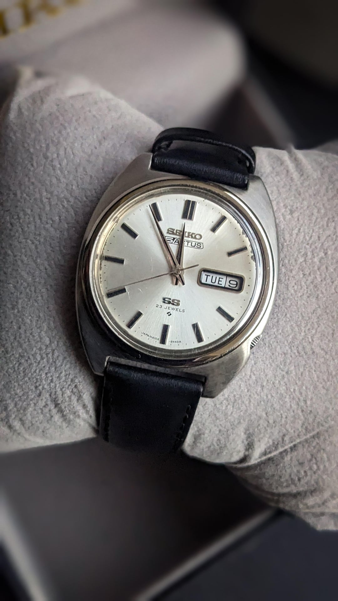 History of the Seiko 5 Actus SS The Seiko 5 Actus line was introduced in Japan in the late 1960s, positioned as a youthful yet reliable extension of the legendary Seiko 5 series. The “Actus” name was derived from the Latin word meaning “active” representing a new generation of automatic watches designed for young professionals who wanted style, performance, and everyday durability. The “SS” designation on the dial stands for Seiko Sports, emphasizing robustness and improved water resistance compared to standard dress models. The Seiko 5 Actus watches were part of Seiko’s effort to appeal to the growing domestic market, particularly among university students and young office workers in 1970s Japan. Produced by the Suwa Seikosha factory (indicated by the Suwa logo above 6 o’clock), this model ,reference 6106-8420 , houses the reliable Caliber 6106 automatic movement working fine not serviced known for its 23 jewels, day-date function, and hacking seconds feature. The tonneau-shaped case and minimalist silver sunburst dial reflect the bold yet refined design trends of early 1970s Japanese horology. Description Brand: Seiko Model: Seiko 5 Actus SS (Sports) Reference: 6106-8420 Movement: Automatic, Seiko Cal. 6106 (23 Jewels, hacking seconds, quickset day/date) not serviced Production Era: Circa 1970 Manufacture: Suwa Seikosha, Japan Dial: Silver sunburst finish with applied bar indices and baton hands Case: Stainless steel tonneau case, brushed and polished surfaces Crystal: Acrylic (domed) Water Resistance: “Water Resistant” (original factory rating) Strap: Black leather (aftermarket replacement) Case Back: Screw-down stainless steel with Seiko 5 Actus engraving Functions: Hours, minutes, seconds, day-date (English/Japanese display) Timestamp: https://imgur.com/a/UKM9DZi Price 275$