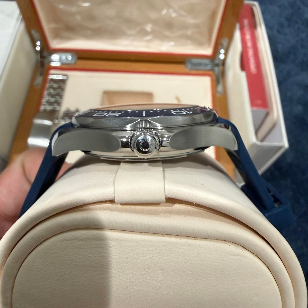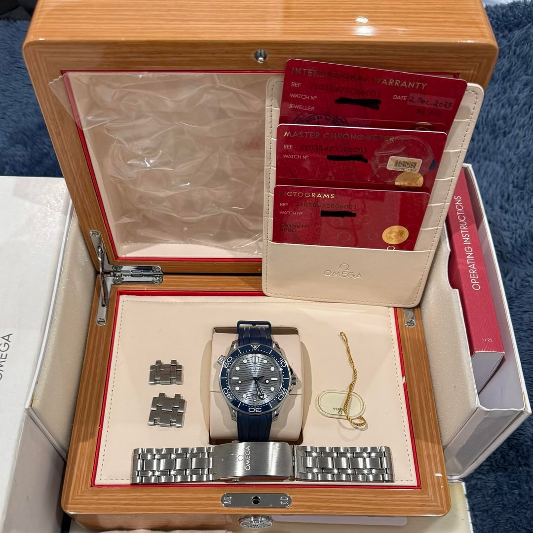 Listing is the Omega Seamaster Diver 300m 42mm. Reference 210.30.42.20.06.001. Blue bezel, chrome dial. Warranty card dated December 2023. This watch came on bracelet. Purchased and had Omega rubber straps installed at my local AD. Will come with both rubber straps and bracelet. Great cosmetic condition overall. Minor hairline scratches on case, bracelet, and strap buckle. Clean crystal as far as my eyes can tell. Movement going strong. Watch will come as full set shown in first photo. Watch is located in Concord, California. Can be shipped fully insured with signature via USPS, UPS, or FedEx, buyer’s choice. No international shipping. Payment via wire, Zelle, Venmo, or Paypal. Asking $3900 net to me. Feel free to pm me with any question. Happy to hop on a call to show the watch, or take any specific photo you are looking for. Thank you! Link to photos on google drive: https://drive.google.com/drive/folders/15d74kmmt6Iu80PecOMC0LlBEP2PlEDop