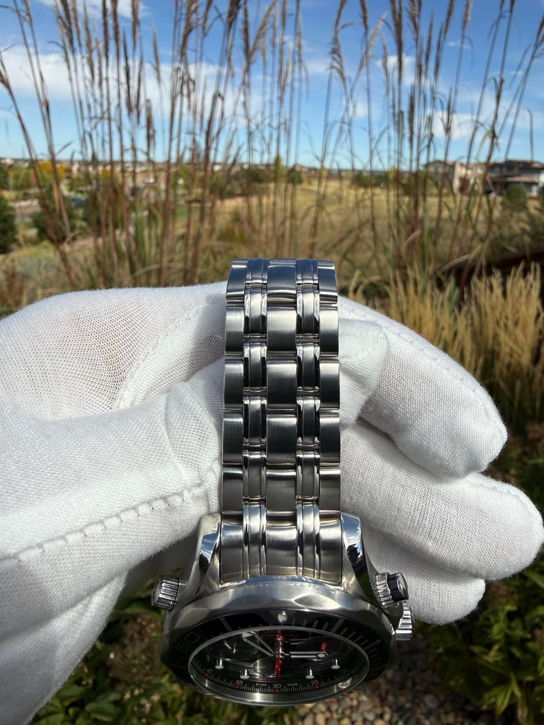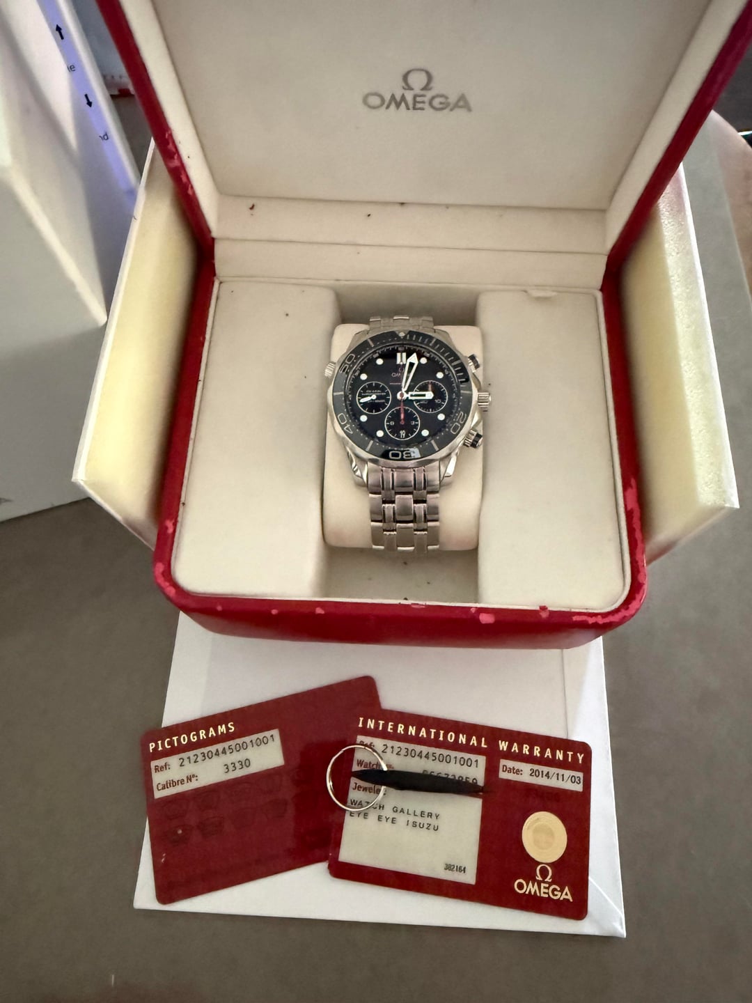 Hi WatchExchange, Up for grabs today is an Omega Seamaster 300M Chronograph, reference 212.30.44.50.01.001. This is a robust and classic dive chronograph from Omega, featuring the iconic Seamaster design with added timing functionality and a striking black wave-pattern dial. It’s a fantastic all-around tool watch that balances sporty looks with real underwater capability. Specs: • Model: Omega Seamaster Diver 300M Chronograph • Reference: 212.30.44.50.01.001 • Case Size: 44mm • Movement: Omega Caliber 3330 (Co-Axial, automatic, column-wheel chronograph, 52-hour power reserve) • Case Material: Stainless Steel • Bezel: Black ceramic unidirectional dive bezel • Crystal: Sapphire with AR coating • Bracelet: OEM Omega stainless steel bracelet • Water Resistance: 300m / 1000ft • Dial: Black wave-pattern dial with luminous hands and markers • Functions: Time, Date, Chronograph, Helium Escape Valve Condition: This watch is in excellent condition overall. It essentially presents flawlessly other than some very very light ar coating scratches on the crystal. These are almost impossible to see and can only be seen if the sun hits them just right. I couldn’t even get a photo them. Service history is unknown but keeping excellent time and all chronograph functions are working perfectly. See timegrapher picture. Included in Sale: • Omega Seamaster 300M Chronograph (Ref. 212.30.44.50.01.001) • Inner and outer boxes • Manual & cards (pictogram, warranty, chronometer) • Card holder Price: $3,750 USD via PayPal F&F / Zelle / Wire. Shipping: Fully insured shipping within CONUS included in the asking price. References: I have multiple smooth transactions here on r/WatchExchange and elsewhere. Happy to provide references on request. I’m also happy to do a quick FaceTime or video call for serious buyers. Thanks for looking! Feel free to reach out via PM with any questions. Thanks for looking. Cheers!