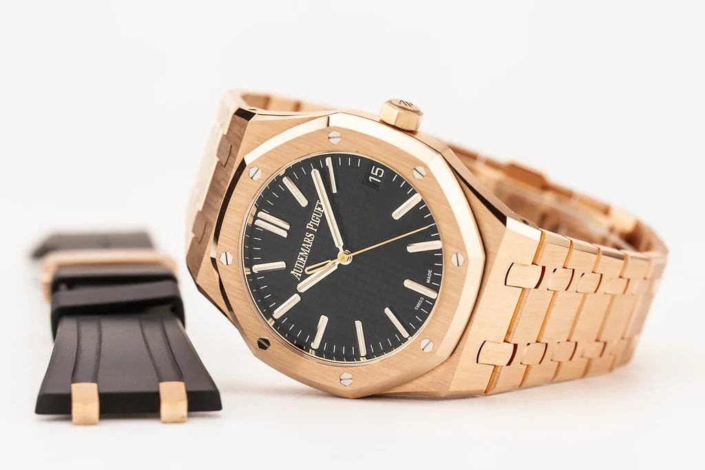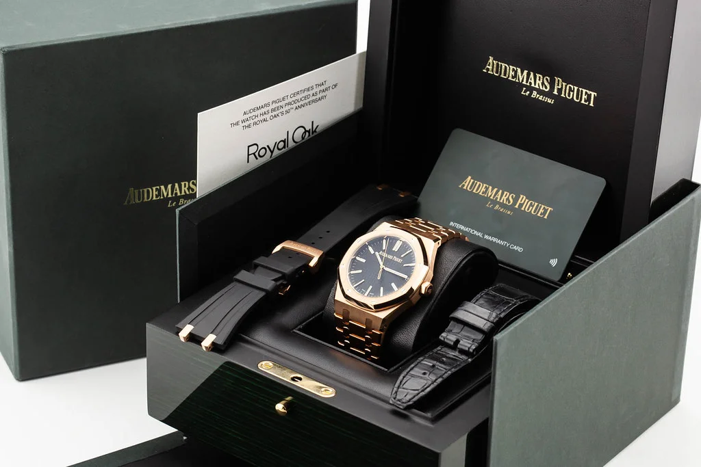 Up for sale is a mint / near-new condition Audemars Piguet Royal Oak 50th Anniversary Special Limited Edition Release Rose Gold Black Dial, reference # 15510OR.OO.D002CR.01. This watch is converted and includes a rose gold bracelet, rubber & alligator leather straps, and deployant clasp. All OEM AP. It comes complete with all boxes, papers, booklets, OEM straps and clasp, and AP International Warranty Card dated July 2022.
