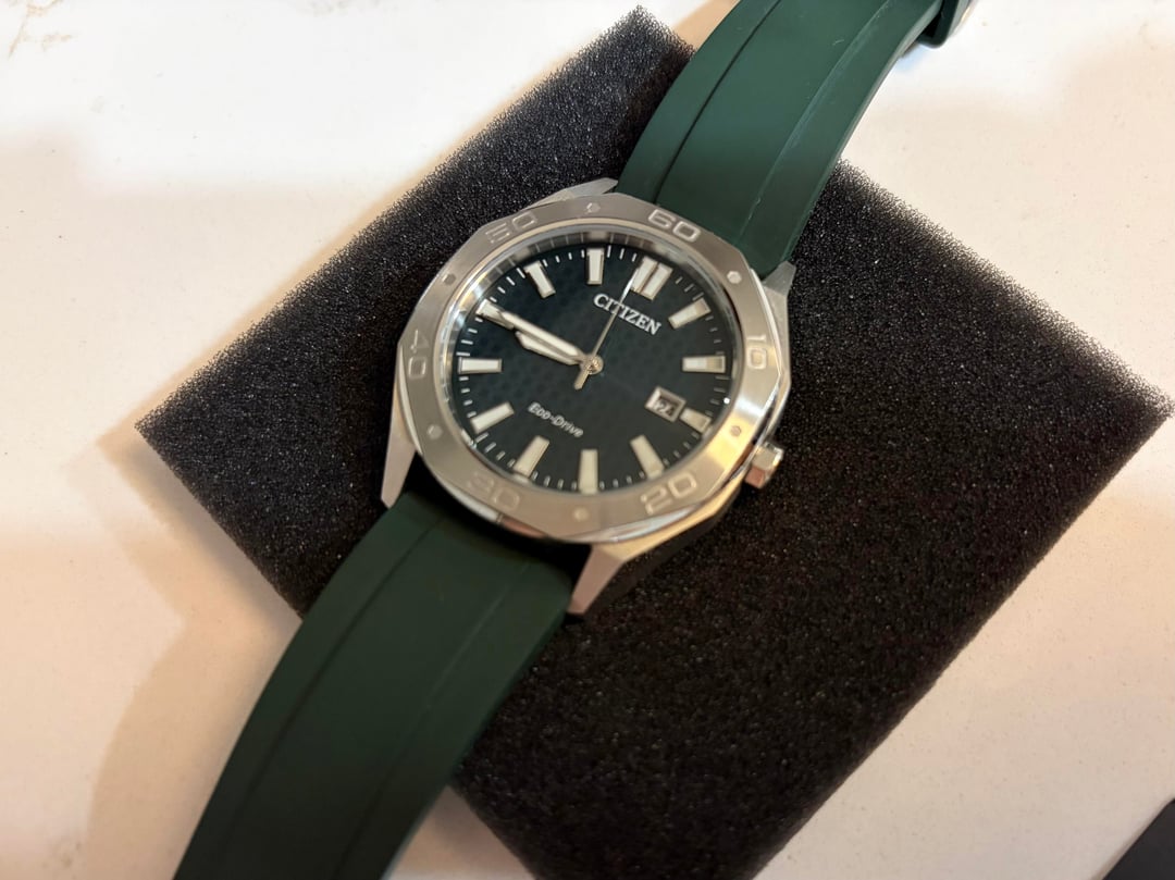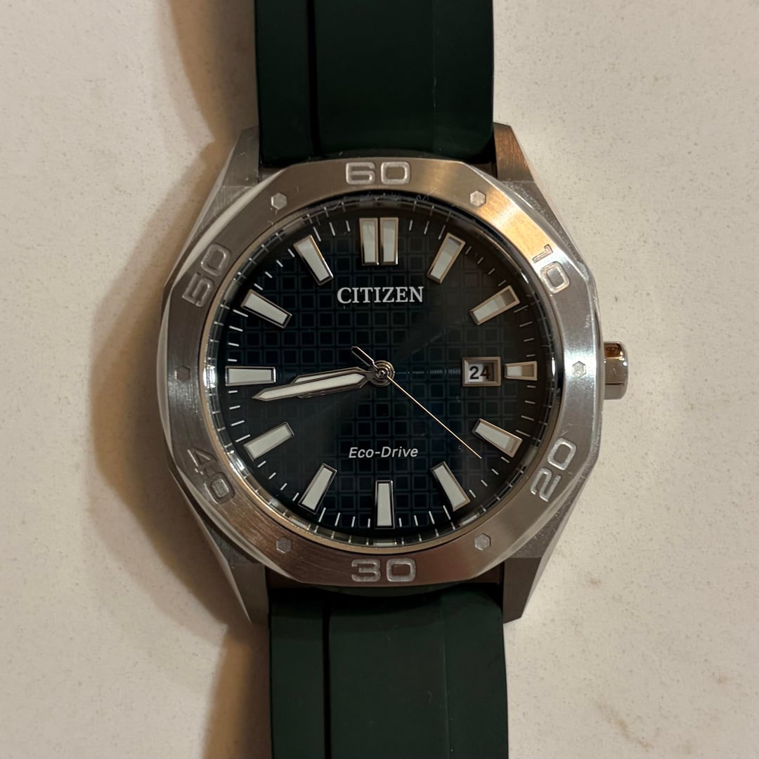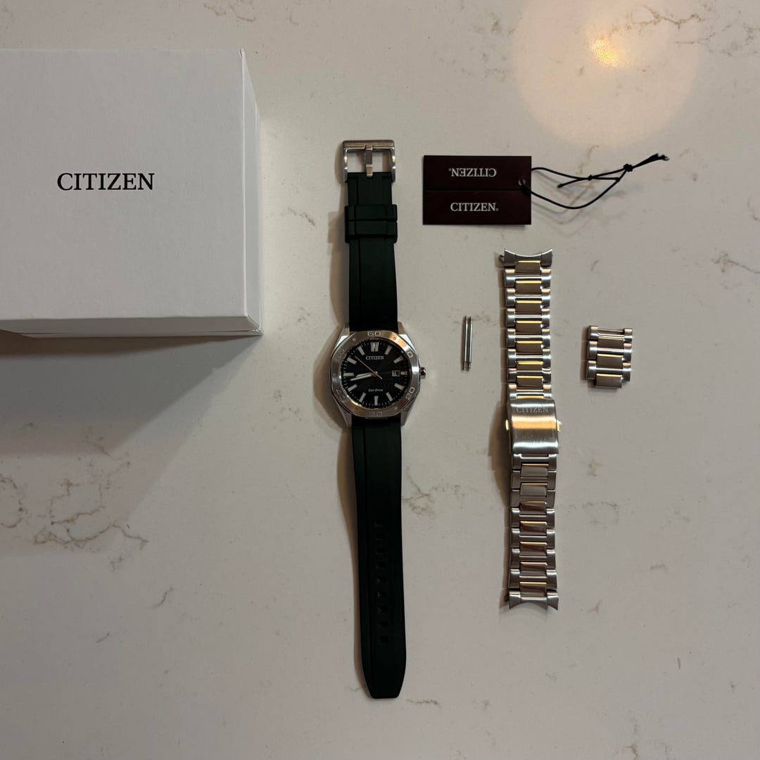 **Citizen Odyn** 📔Reference: BM7630-80X Excellent condition with no notable sign of wear. 📏Size: 41mm ⚙️Movement: Eco-Drive E111 🟩 BlueShark FKM Ridge rubber strap ($39 value). 💰Price: $1️⃣2️⃣0️⃣ 💵Zelle/Wire/PayPal for payment (F&F preferred +3% for G&S). Timestamp: [https://imgur.com/a/3lqDbE0](https://imgur.com/a/3lqDbE0) 🚢 Shipping: Free UPS Shipping to Continental US only 🇺🇸 I’m selling off the watches from my collection that I rarely wear. Feel free to message me with any additional questions or concerns.