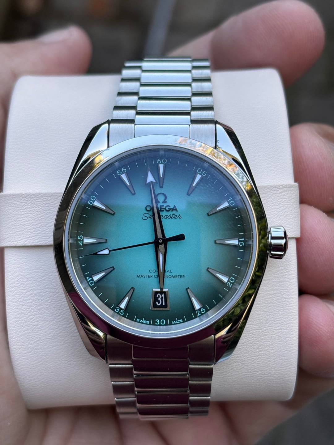 For sale today is my stunning Omega Seamaster Aqua Terra with the eye-catching turquoise gradient dial. This 38mm model was released in 2024 and features a beautiful lacquered finish that transitions from a lighter turquoise at the center to a darker shade at the edges. It's a fantastic everyday watch with a pop of color, powered by Omega's excellent Master Chronometer movement. **Condition:** Excellent unworn condition. The case and crystal are flawless. **Full Kit:** Full kit with inner and outer boxes, Master Chronometer card, pictogram card, warranty card dated 12/24, and all original links **Model:** Omega Seamaster Aqua Terra 150M Master Chronometer **Reference:** 220.10.38.20.03.005 **Case:** 38mm symmetrical stainless steel case **Dial:** Lacquered turquoise gradient dial **Crystal:** Domed scratch-resistant sapphire with anti-reflective treatment **Movement:** Omega Co-Axial Master Chronometer Calibre 8800 **Power Reserve:** 55 hours **Water Resistance:** 150 meters (500 feet) **Bracelet:** Stainless steel bracelet with comfort-adjustment clasp **Lug-to-Lug:** 44.9mm **Lug Width:** 19mm **Reason for Selling:** Bought as a gift for someone that won’t remove the smartwatch from their wrist (haha), so making room in the collection for a new purchase. **Trades:** No trade offers at this time. **Location:** Located in Atlanta, GA and can accommodate a local face-to-face transaction. Happy to facetime for verification. **Price:** $6,000 with 2 day CONUS shipping included **Payment:** (PayPal G&S, Wise, Venmo, Zelle, Prefer domestic USA due to current shipping costs, but will discuss international) Please comment "PM" before sending a message. Happy to provide more pictures or information upon request.